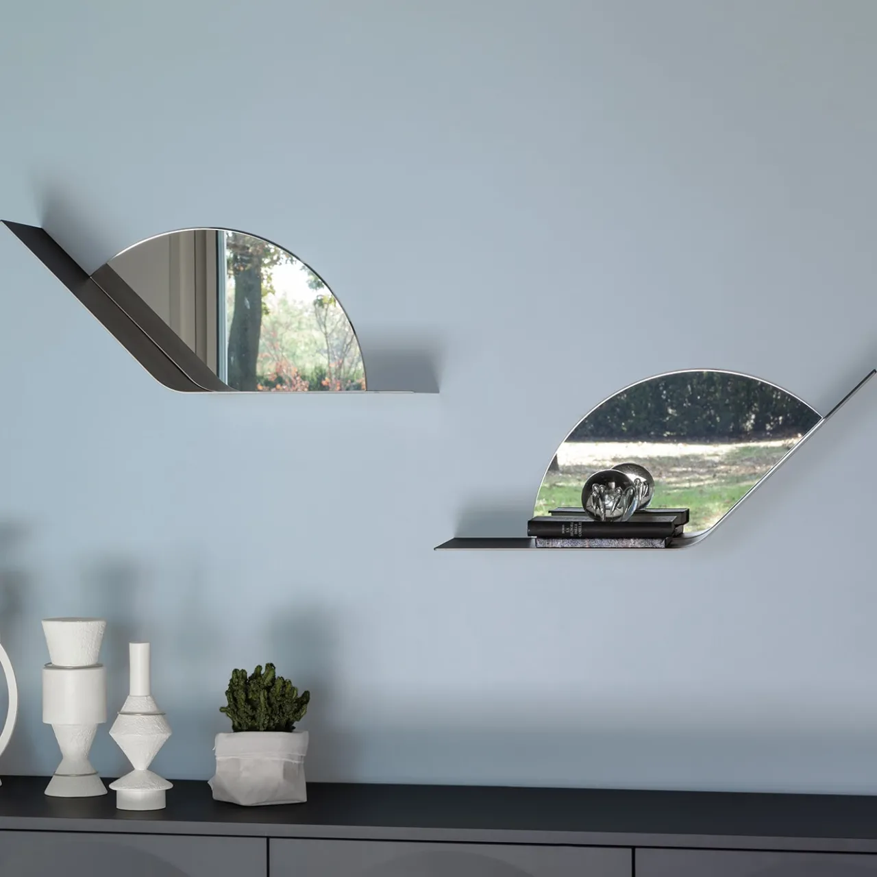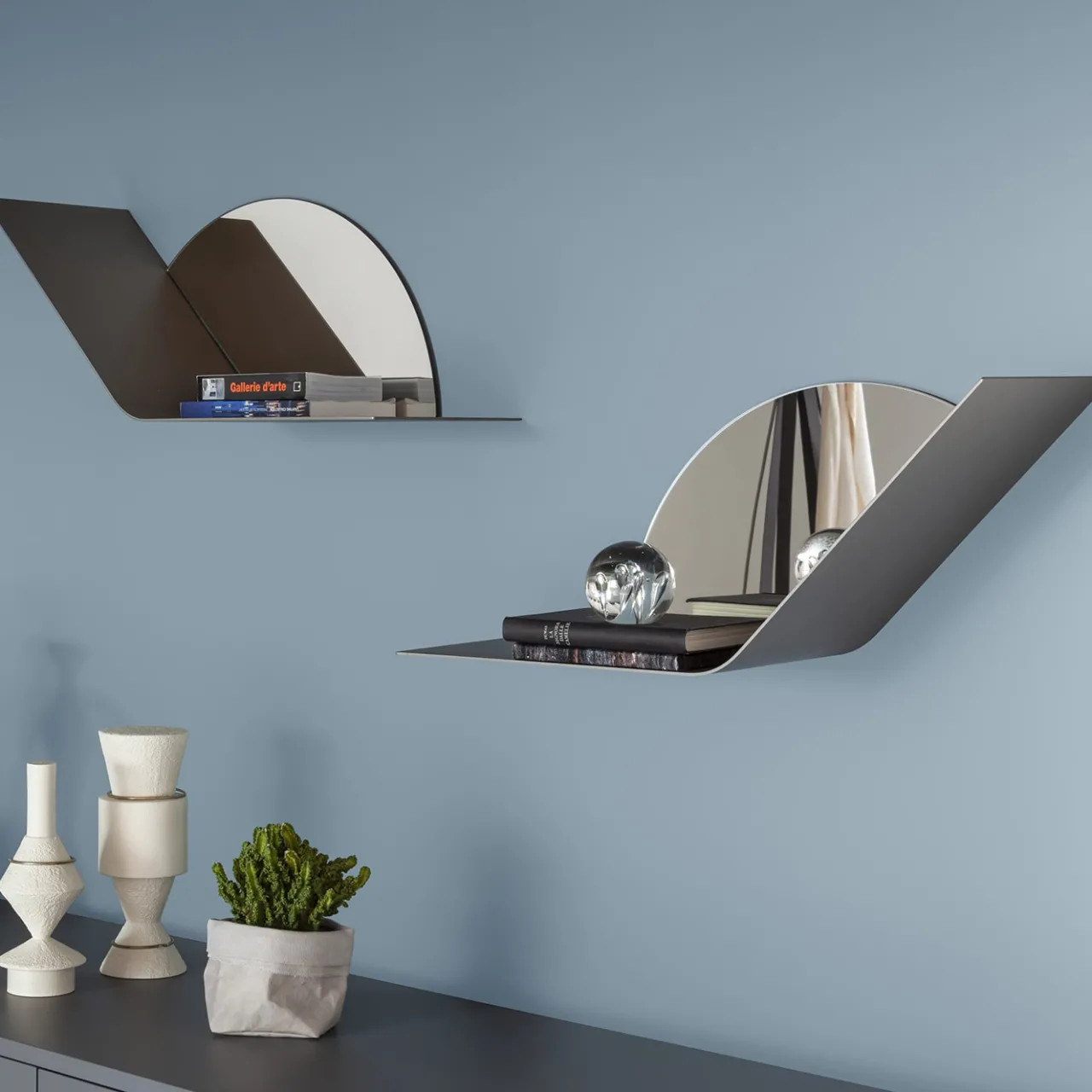 Una silhouette essenziale che non rinuncia a un’ispirazione giocosa contraddistingue questa mensola, realizzata in metallo e che ricorda il corpo stilizzato di una lumaca. Proposta in una raffinata finitura champagne ottenuta con vernici epossidiche, la struttura arrotolata dall’aspetto angolare e la porzione specchiata semicircolare a parete suggeriscono un’esposizione dinamica di libri o vasi.