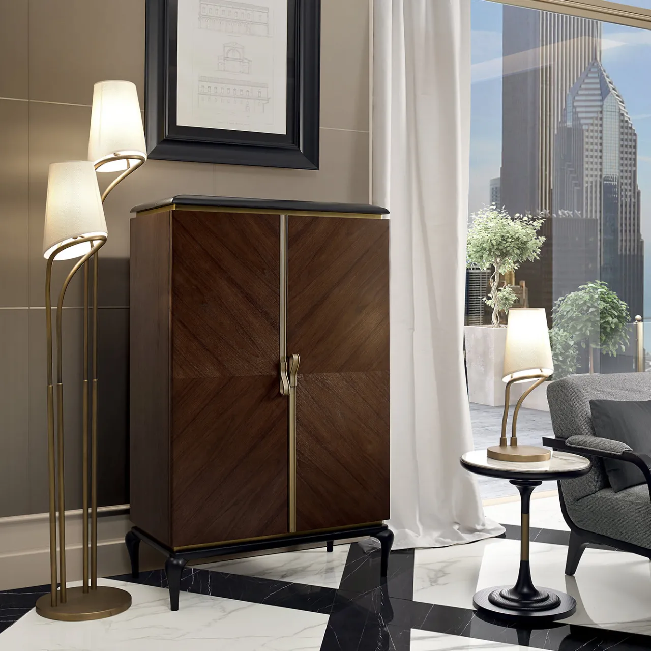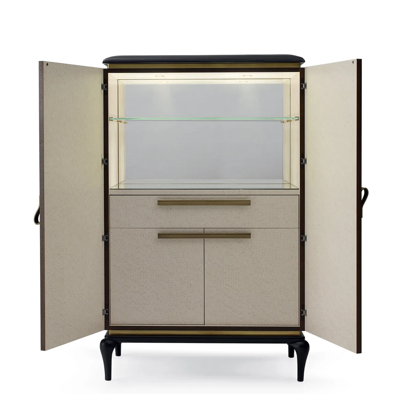 Un elegante mobile di Piero Lissoni sarà un’aggiunta di stile a un arredamento moderno o classico. Realizzato con una solida struttura in multistrato e frassino e MDF noce canaletto, questo mobile è arricchito da maniglie in ottone brunito e profili in frassino massiccio e canaletto. Internamente presenta un cassetto, due scomparti e ripiani in vetro impreziositi da uno schienale a specchio.