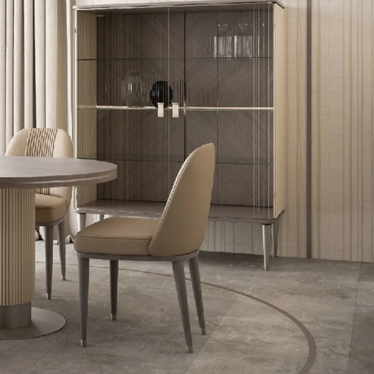 Questo mobile unico, frutto di una sapiente maestria artigianale e di un’estetica innovativa, emana eleganza e raffinatezza. Poggiato su quattro piedini conici in legno con finitura grigia, il mobile in legno laccato beige presenta un sofisticato motivo a fusti scanalati e due ante in vetro con strisce verticali incise. All’interno, il mobile è dotato di tre ripiani in vetro impreziositi dalla finitura grigia e dalle luci incassate. Questo mobile, di una leggerezza e di un equilibrio visivo fuori dal comune, si inserisce perfettamente in qualsiasi salotto, sala da pranzo o studio.
