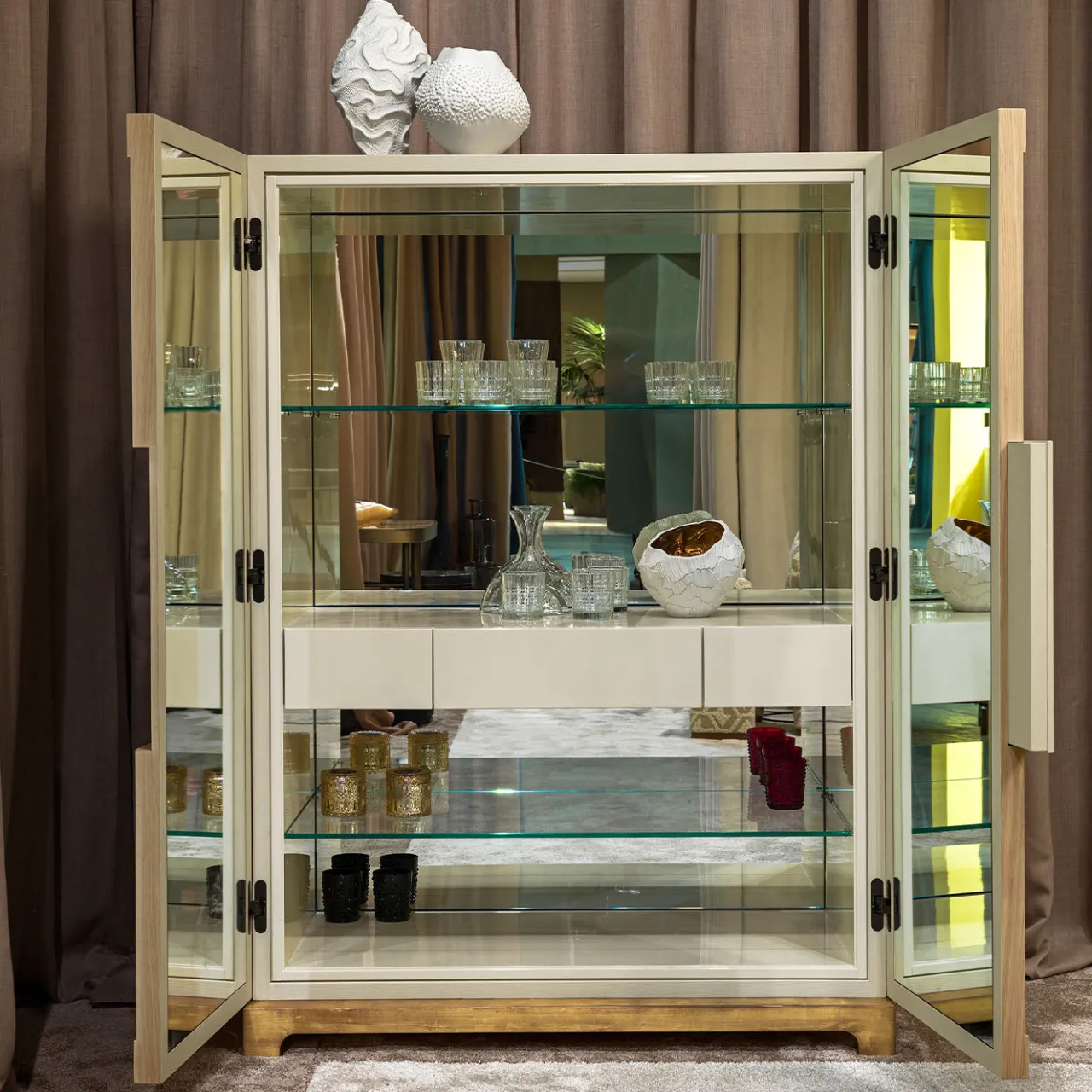 Il mobile Alexander presenta un esterno in rovere avorio dipinto a mano, completato da un paio di porte con una maniglia decorativa in legno massello che mostra intricate lavorazioni. All’interno, uno schienale specchiato e ripiani in vetro con una finitura lucida in lacca valorizzano l’esposizione delle attrezzature da bar. Il mobile poggia su piedi in legno decorati con una finitura in foglia d’oro, combinando eleganza e funzionalità in un pezzo di media grandezza raffinato.