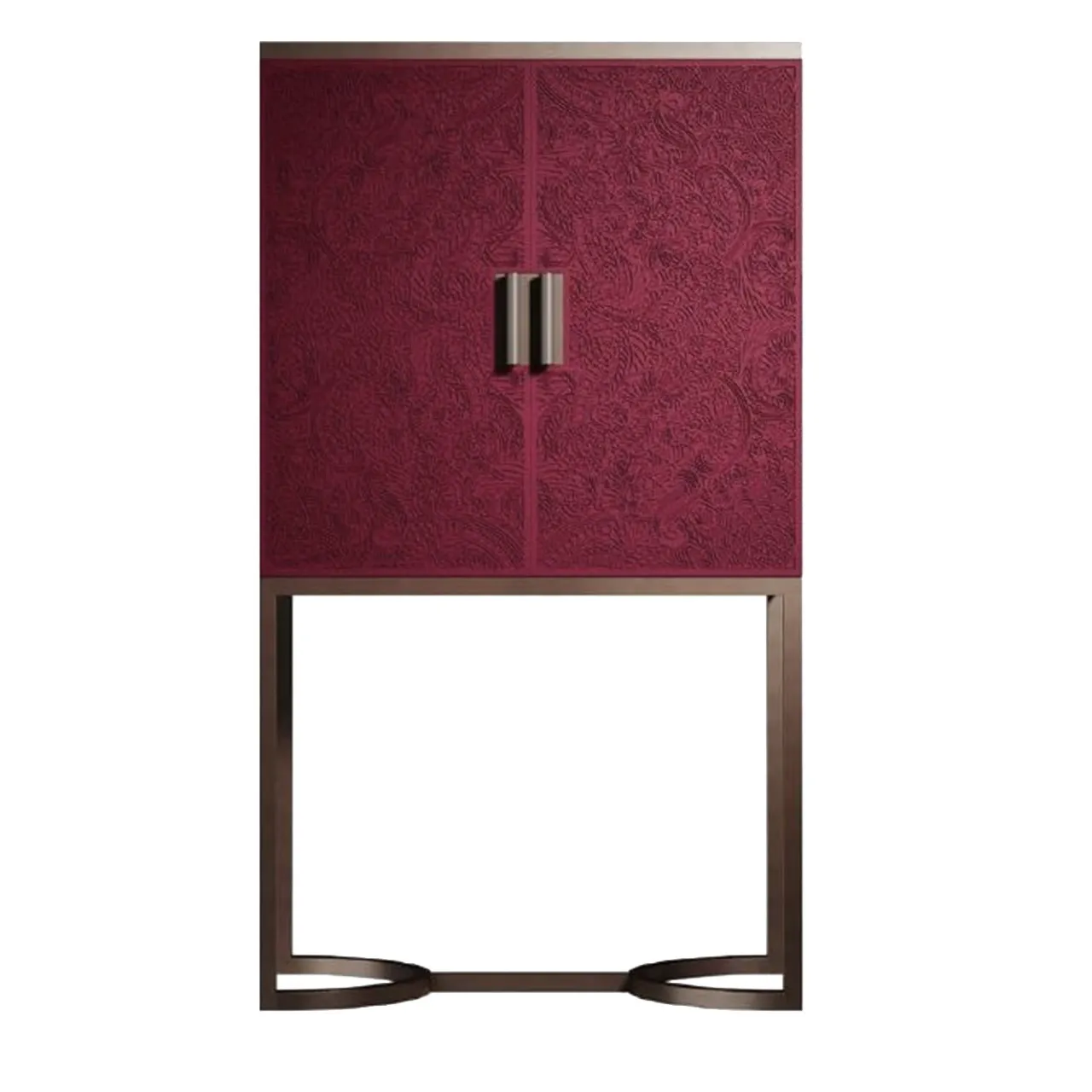 Parte della collezione Bluemoon, questo raffinato mobile bar eleverà qualsiasi bar della sala da pranzo con i suoi colori audaci e le sue linee moderne. Il piano quadrato in legno laccato presenta un accattivante colore cremisi con incisioni paisley e una finitura simile al velluto, ed è sostenuto da una base in metallo grigio dalla forma unica con due semicerchi collegati da una barra centrale. Due ante con maniglie in metallo grigio si aprono per rivelare uno schienale a specchio con un ripiano in vetro al centro. All’interno, il pannello dell’anta e i due piccoli cassetti presentano una finitura scura che aggiunge un contrasto caldo e ricco al pezzo.