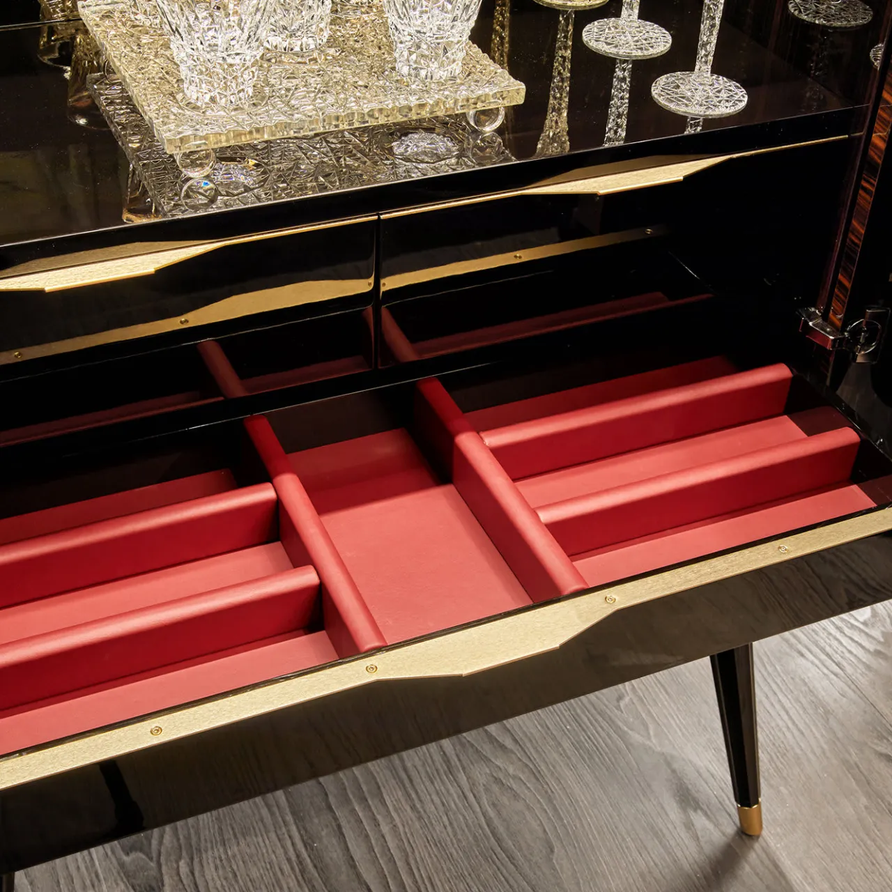 Testimonianza della bellezza del legno naturale, il mobile bar Brent è realizzato in splendido ebano Macassar, con pannelli accuratamente posizionati che esaltano le venature del legno. Poggiato su gambe svasate ispirate al design moderno di metà secolo, il mobile bar con finitura lucida attira l’attenzione e promette una cena incantevole. Due ante, accenti dorati. È disponibile anche una versione più alta del mobile.