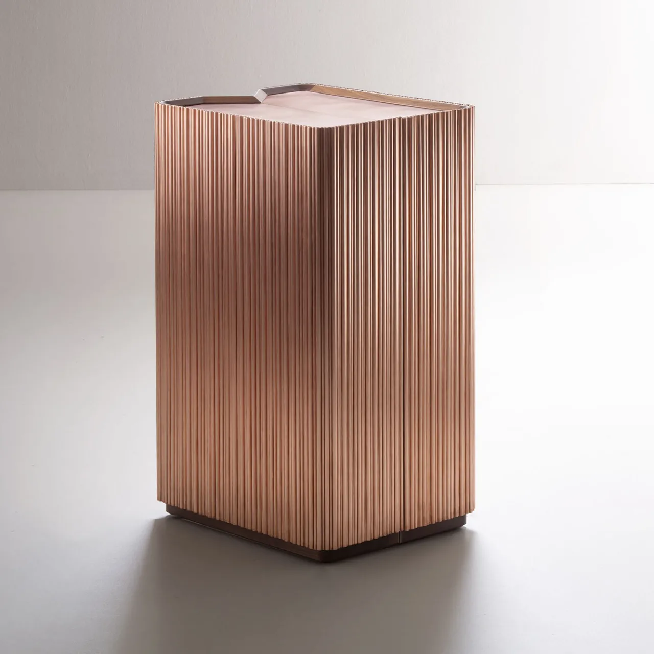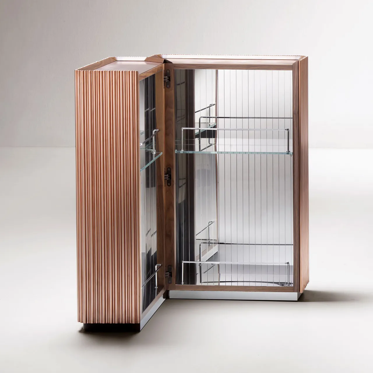 Canneto Barista presenta un’apertura unica a 180° permessa dal design a forma di ‘V’ che allinea con precisione le due metà simmetriche. Dotato di piccole ruote alla base per un funzionamento fluido, il suo interno è in acciaio inossidabile completamente specchiato che migliora l’appeal visivo grazie agli effetti riflettenti. Offre un’archiviazione versatile per bottiglie e bicchieri di varie forme e dimensioni ed è rifinita in un elegante rame spazzolato. Progettato per evocare un’atmosfera raffinata da club o caffè.