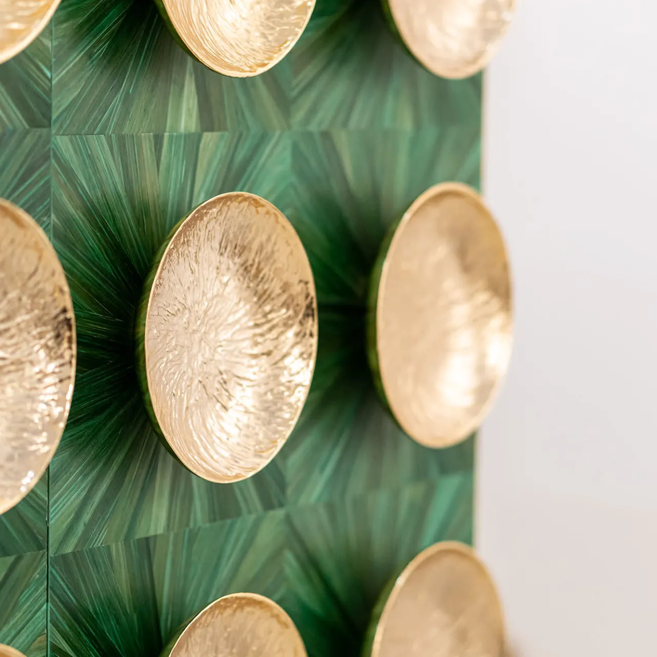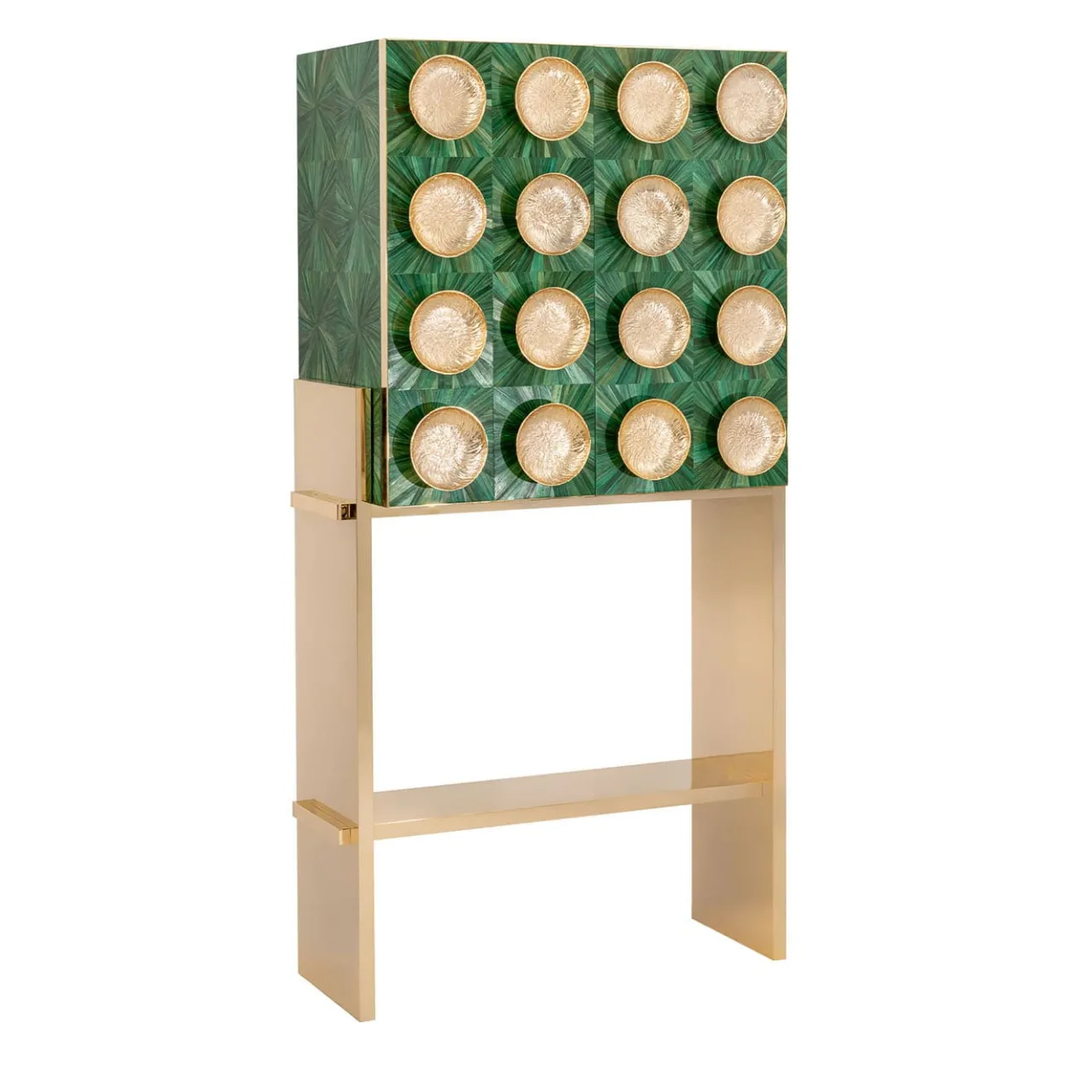 Meraviglioso esempio di artigianato tradizionale con materiali di alta qualità, questo mobile bar è un’aggiunta preziosa ed eccezionale all’arredamento di una sala da pranzo o di un soggiorno. Realizzato in legno massiccio rivestito con lastre di acciaio inossidabile placcate oro 18 carati e specchiate, il frontale è decorato con intarsi in paglia francese con raggi di sole in tonalità verde e maniglie decorative in metallo placcato oro 18 carati. Per ulteriori dettagli, contattare il Concierge.