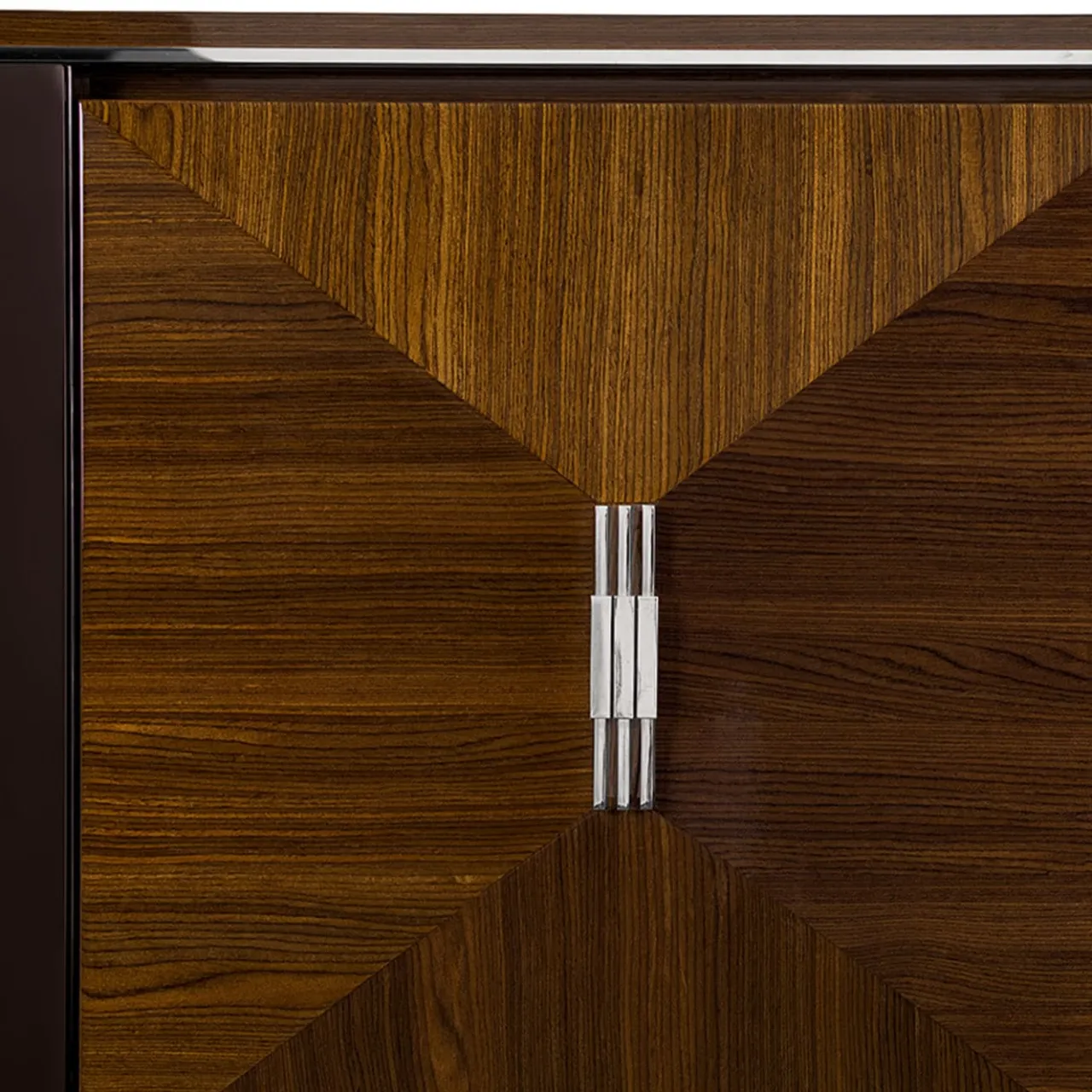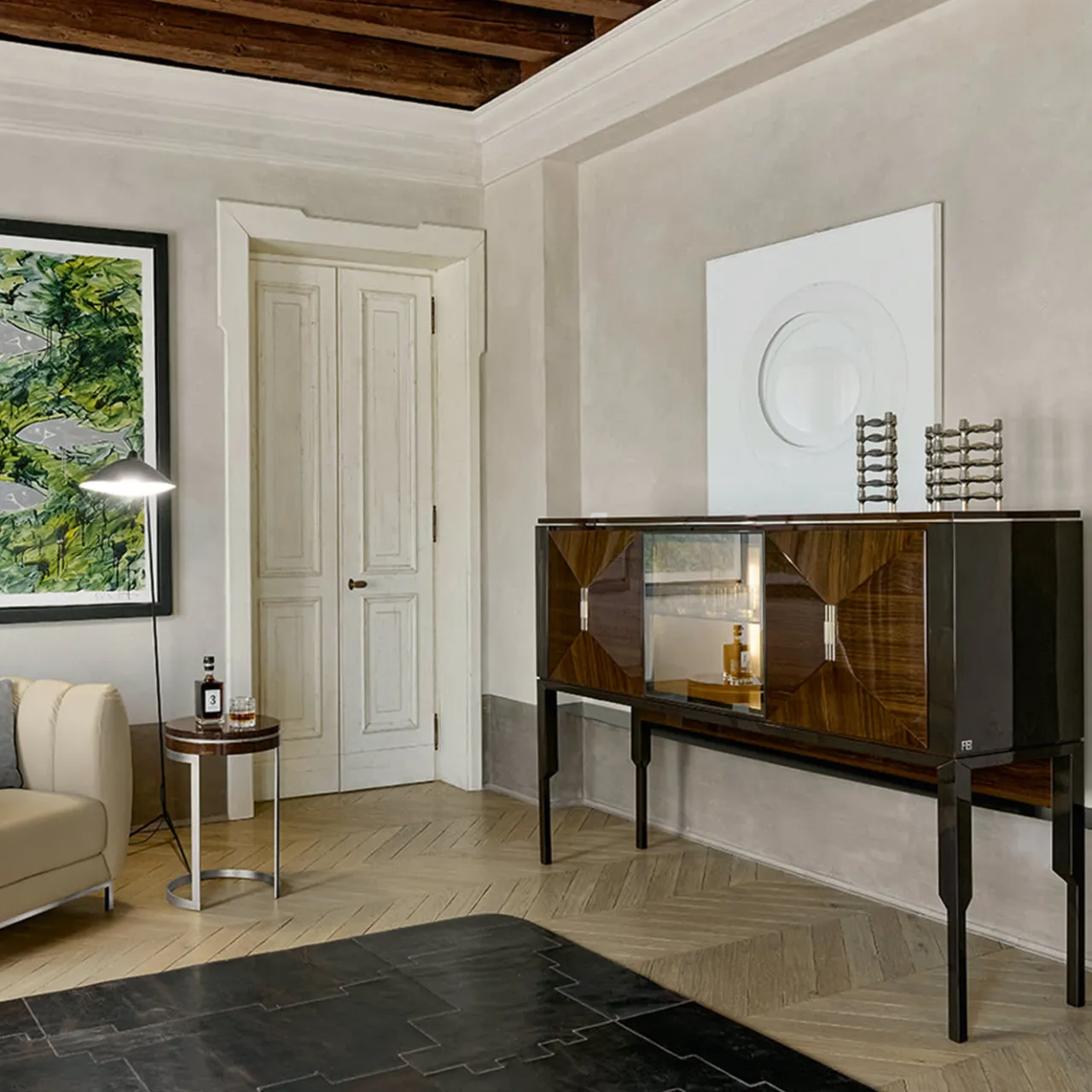 Questo elegante mobile bar ha due ante in legno e una in vetro, con finiture in metallo e gambe laccate. I ripiani in legno e l’apertura push pull completano il design. La finitura lucida Canaletto e la finitura laccata lucida Testa di Moro della struttura sono abbinate a dettagli in metallo Gold e vetro Smoked.