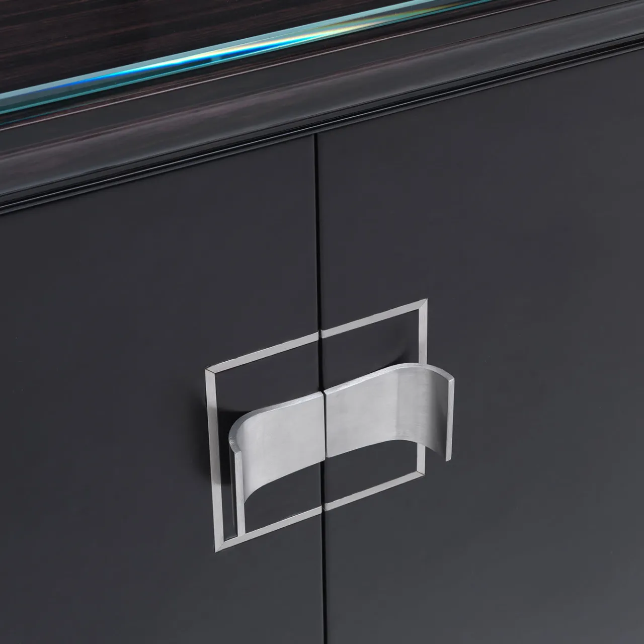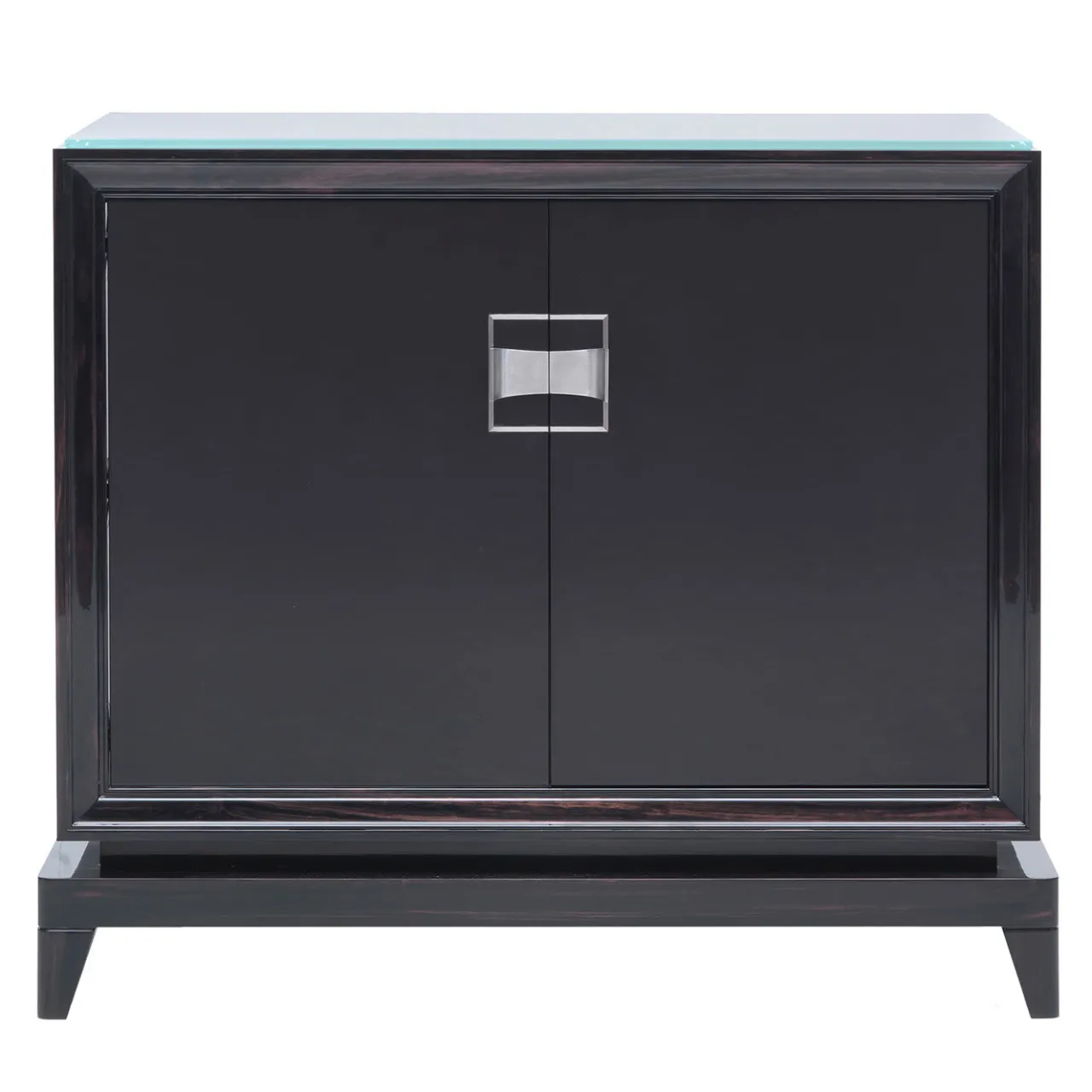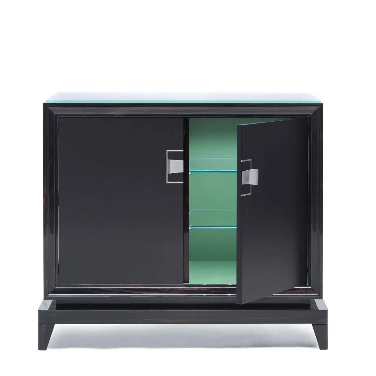 Questo lussuoso mobile bar a due ante in ebano Makassar è dotato di due ripiani interni in vetro trasparente progettati per riporre elegantemente attrezzature per cocktail e squisite collezioni di bicchieri. La sofisticata silhouette che lo caratterizza è un trionfo dell’intenso fascino dell’ebano, interamente lavorato da esperti artigiani e arricchito da pregiati inserti in pelle.