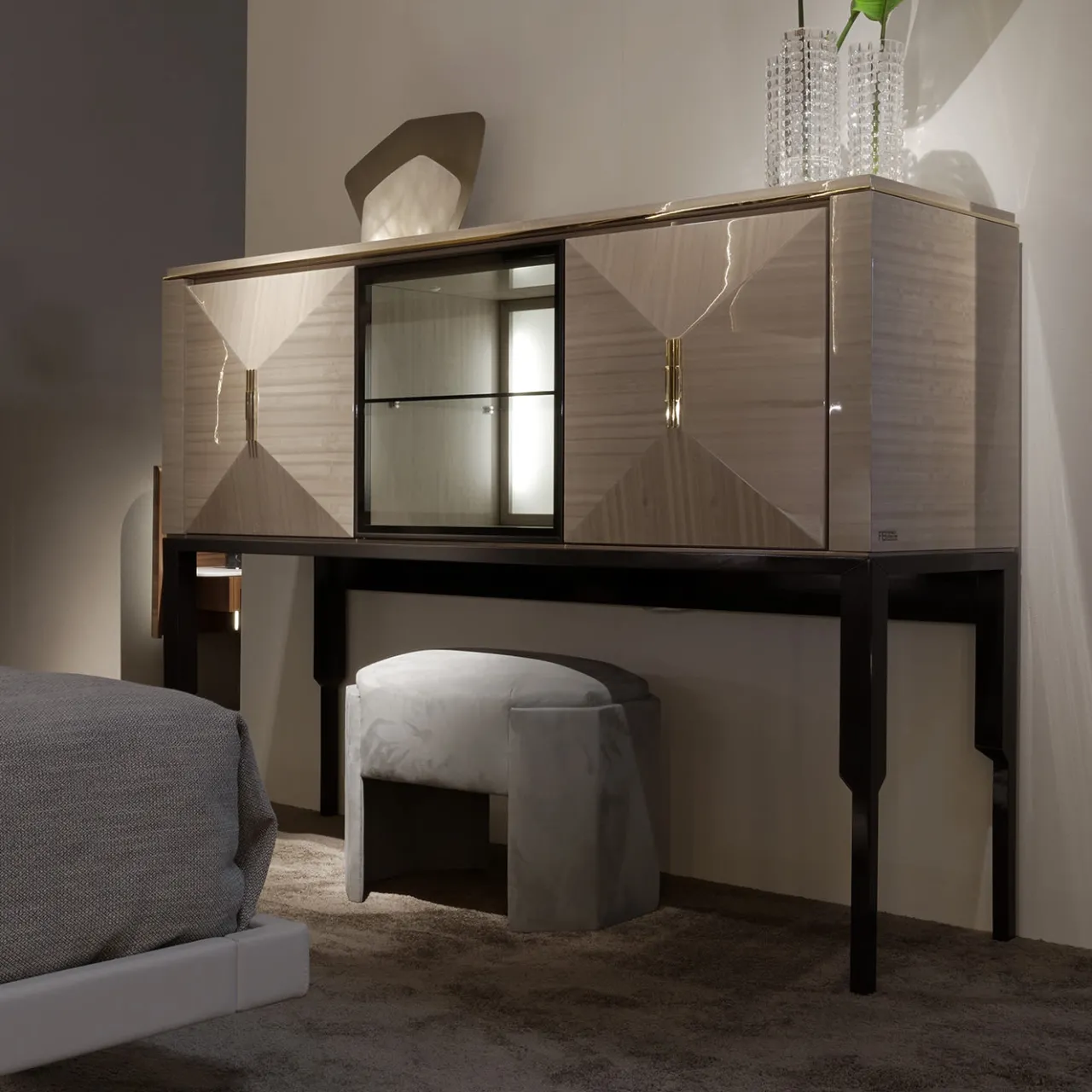 Un mobile bar di grande effetto, con due ante dall’accattivante effetto piramidale 3D e un’anta centrale in metallo verniciato antracite. Realizzato in legno di Eucalipto con finitura lucida, il mobile è impreziosito da eleganti profili in metallo dorato e da accenti decorativi. Le eleganti gambe in faggio tinto antracite sostengono questo pezzo sofisticato, mentre le luci LED integrate illuminano il vano centrale.