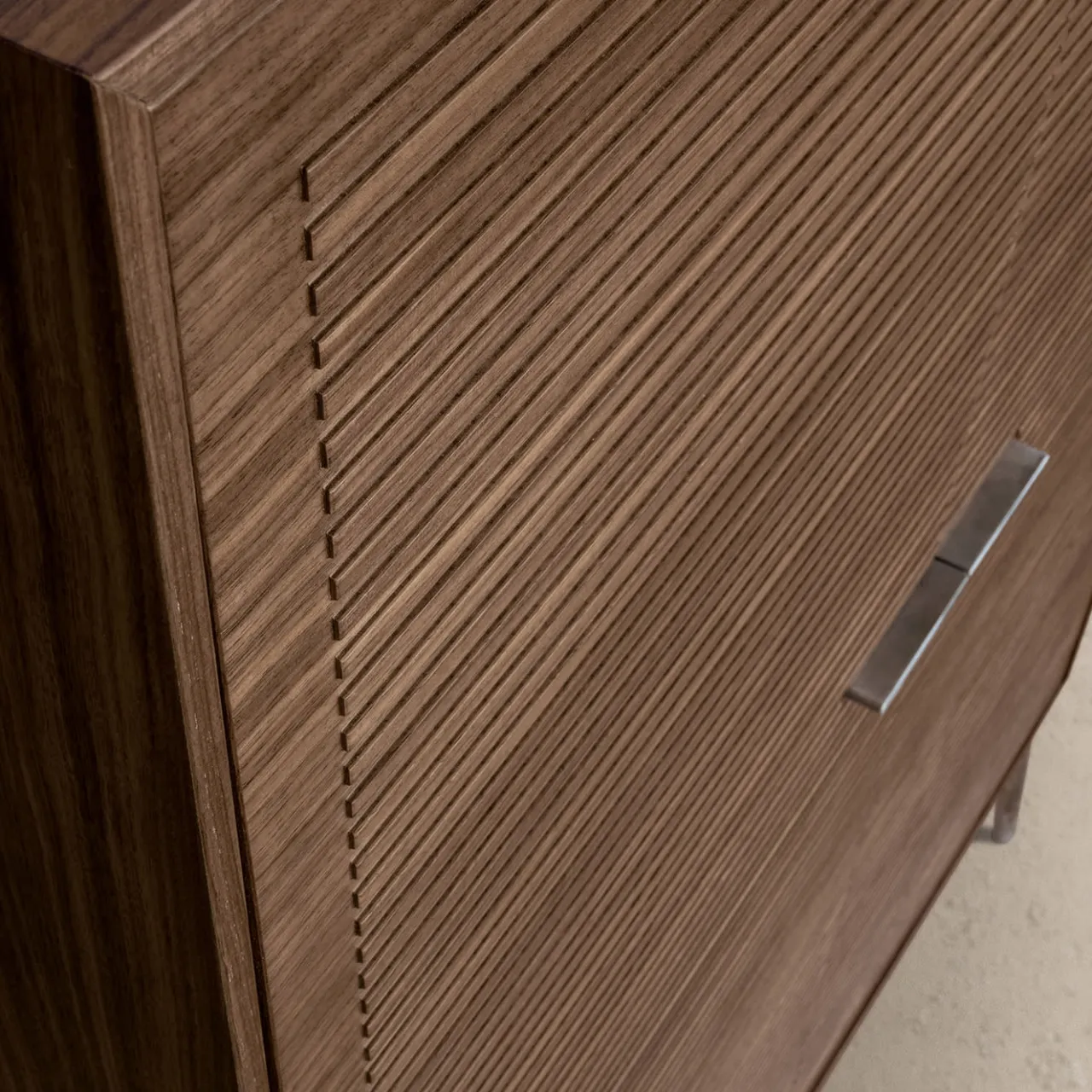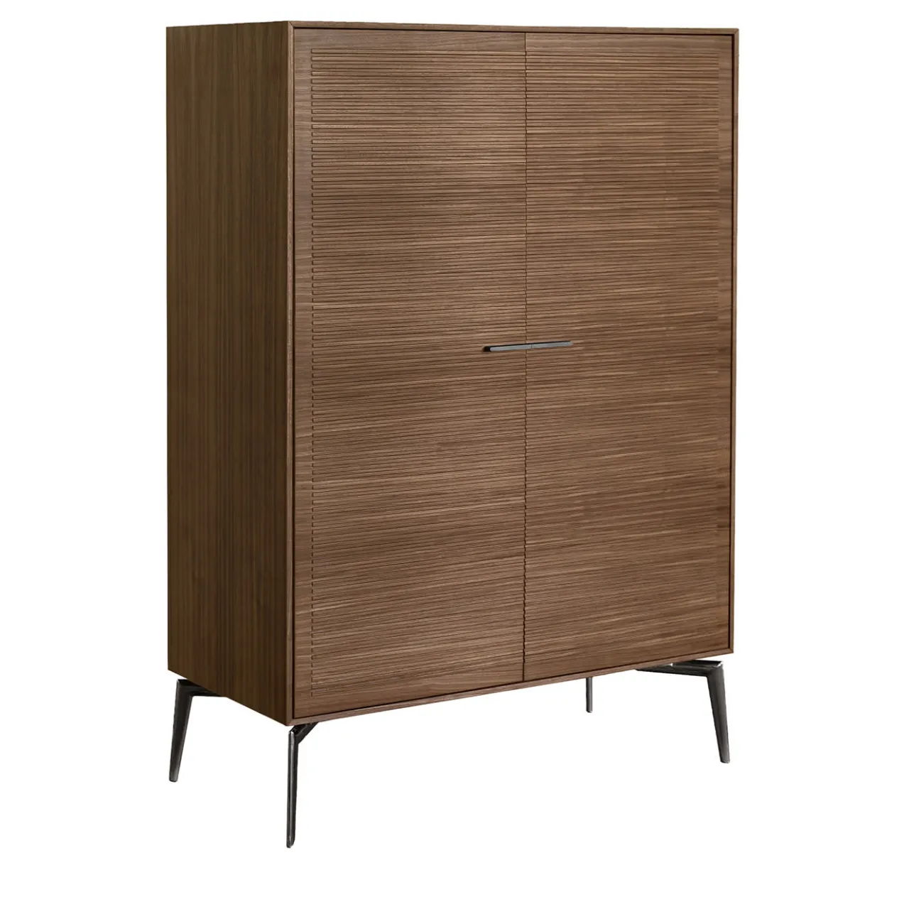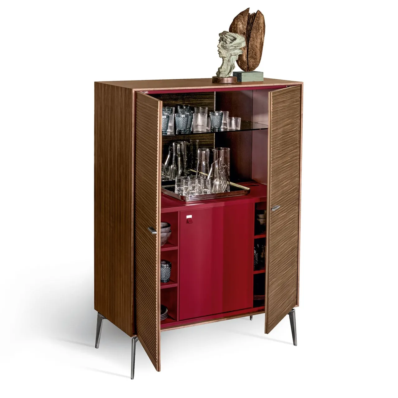 Materiali raffinati e texture selezionate per il loro carattere esclusivo sono elegantemente combinati in questo superbo mobile bar. Illuminato da una luce LED, l’interno rivela un frigorifero di categoria A+++ abbinato a un ripiano superiore in vetro e a un ripiano il cui rivestimento in pelle (bordeaux o color fango) si armonizza con la laccatura del mobile interno. Il retro del mobile presenta la stessa finitura dell’interno. Definita da un’intrigante texture a coste sulle ante, la finitura esterna in noce è sottilmente contrastata dalle lineari maniglie in nichel nero e dai piedini angolari. Per le varianti, contattare il Concierge.
