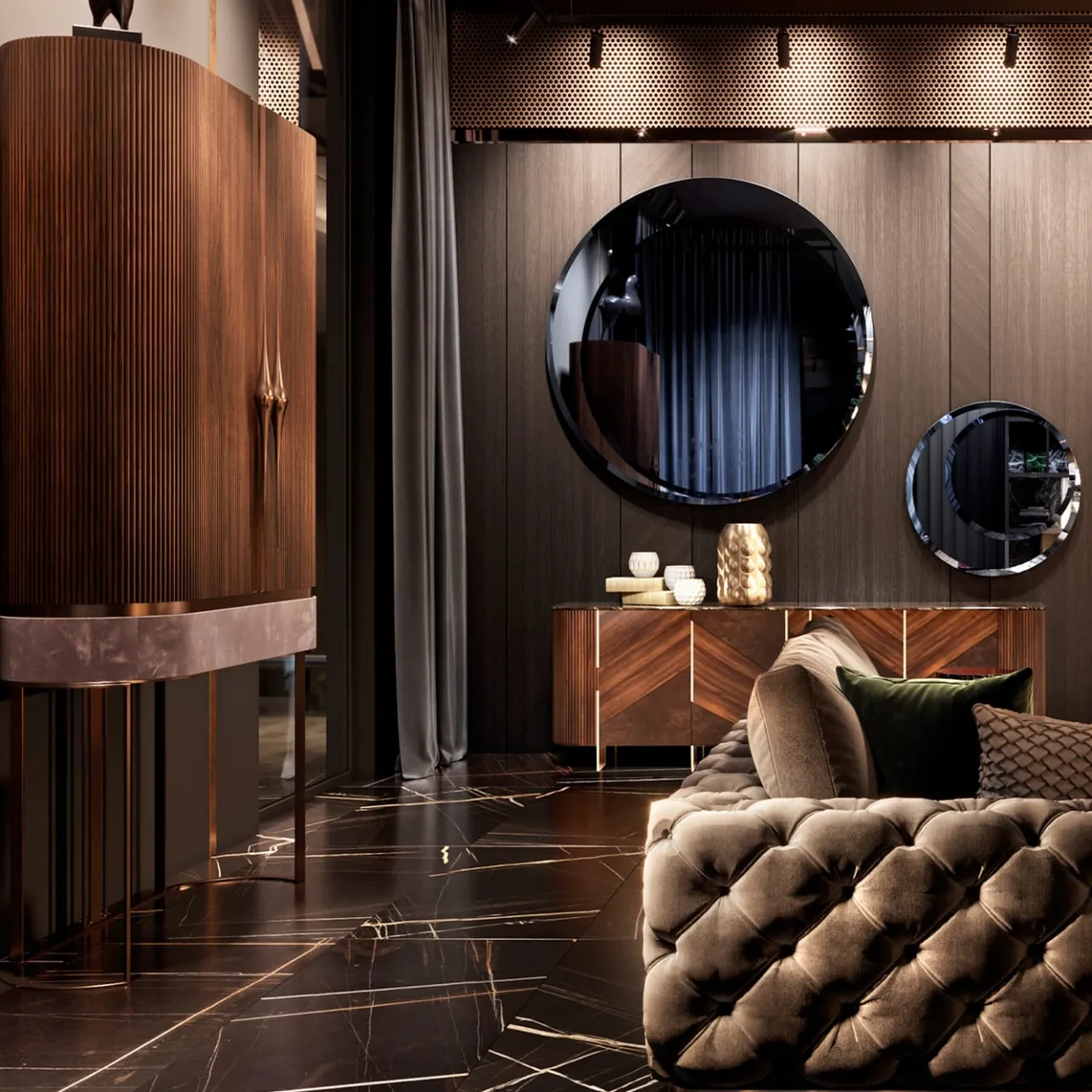 Il mobile bar è in legno scanalato di noce canaletto e poggia su un’alta base metallica, che gli conferisce armonia e proporzione. Due importanti maniglie in metallo sono caratterizzate dalla nuova finitura rame che si ripete nella base. Una fascia rivestita in nabuck impreziosisce e amplia la possibilità di personalizzazione.