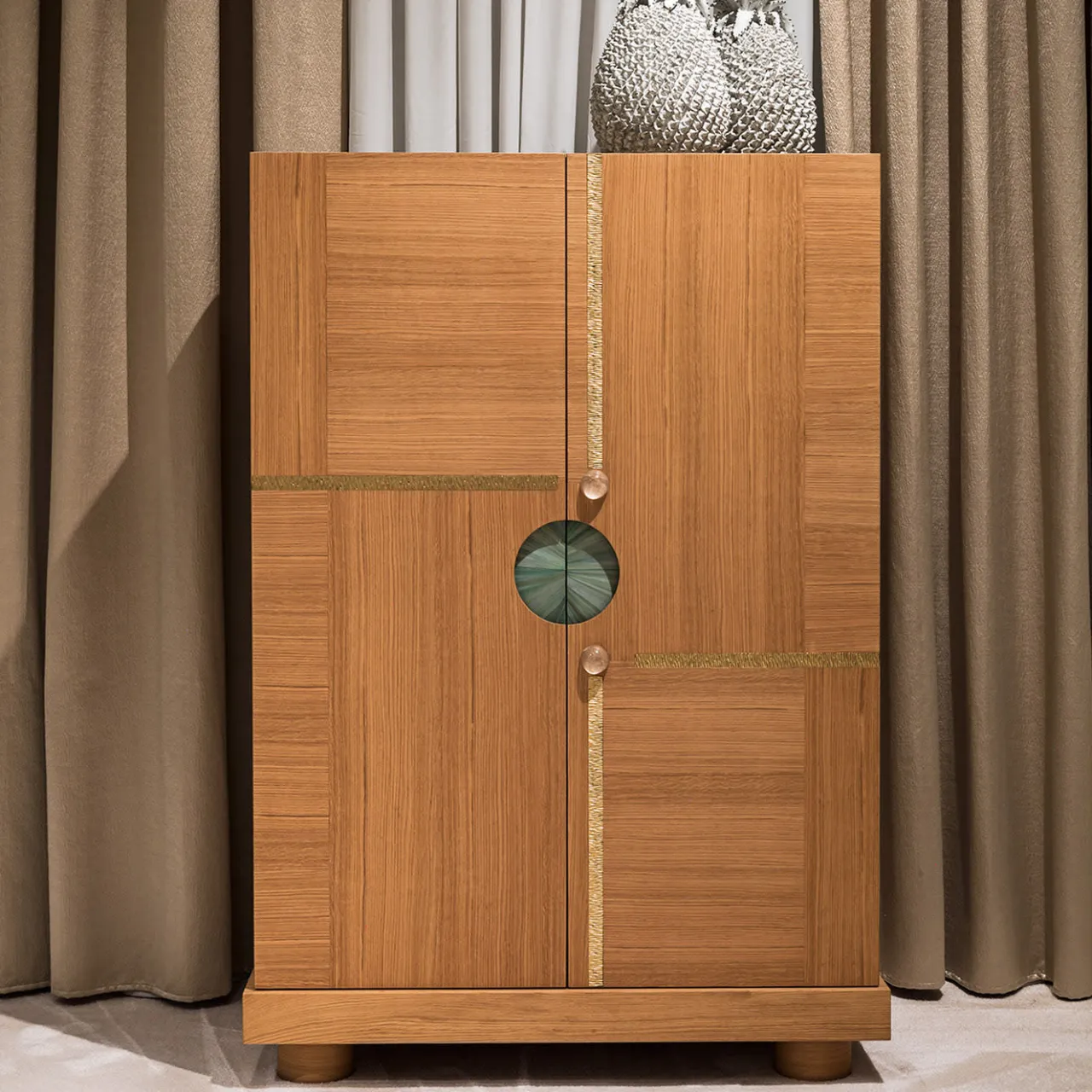 Mobile bar in legno di quercia lavorato a mano con due ante. Lato esterno in legno di rovere, colore naturale e finitura opaca. Ante con intarsio contemporaneo in legno di rovere, quattro elementi decorativi in ottone e due dettagli in cristallo di rocca. Finitura laccata lucida di colore bianco, inserti a specchio e ripiani in vetro all’interno.