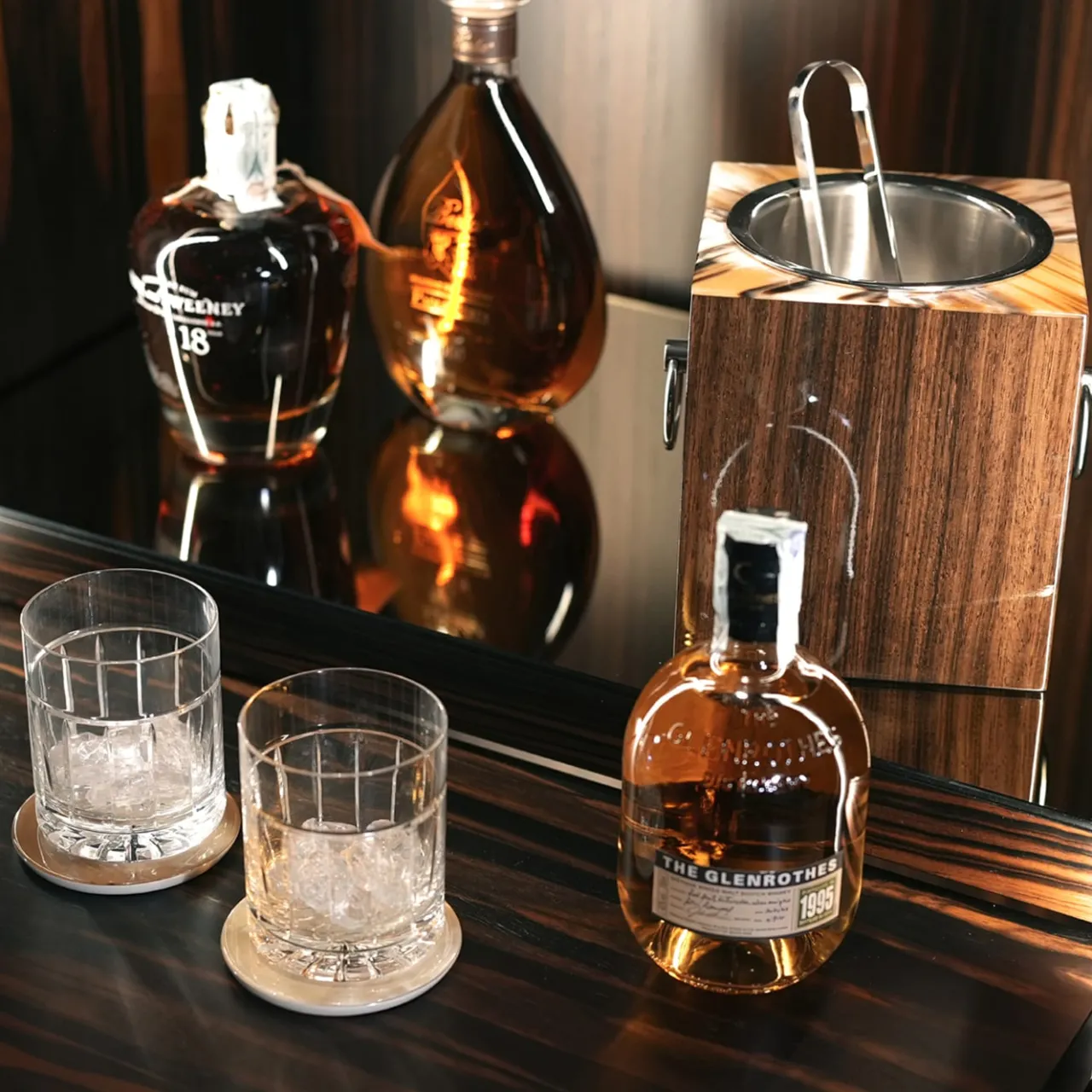 Cantinetta per vini impiallacciata in ebano Macassar opaco. Maniglie in ottone brunito con gemme di corno sfaccettate. La cantina è dotata di vassoi scorrevoli per conservare 24 bottiglie di vino, 15 bottiglie di champagne e 12 bottiglie magnum. Dotata di sistema di refrigerazione multi-temperatura. La cantina viene fornita con quattro sottobicchieri rotondi in corno e lacca avorio, un secchiello per il ghiaccio in ebano Amara opaco e corno, un cavatappi in corno e acciaio inox. Per maggiori dettagli, contattare il Concierge. Bicchieri e bottiglie non sono inclusi.