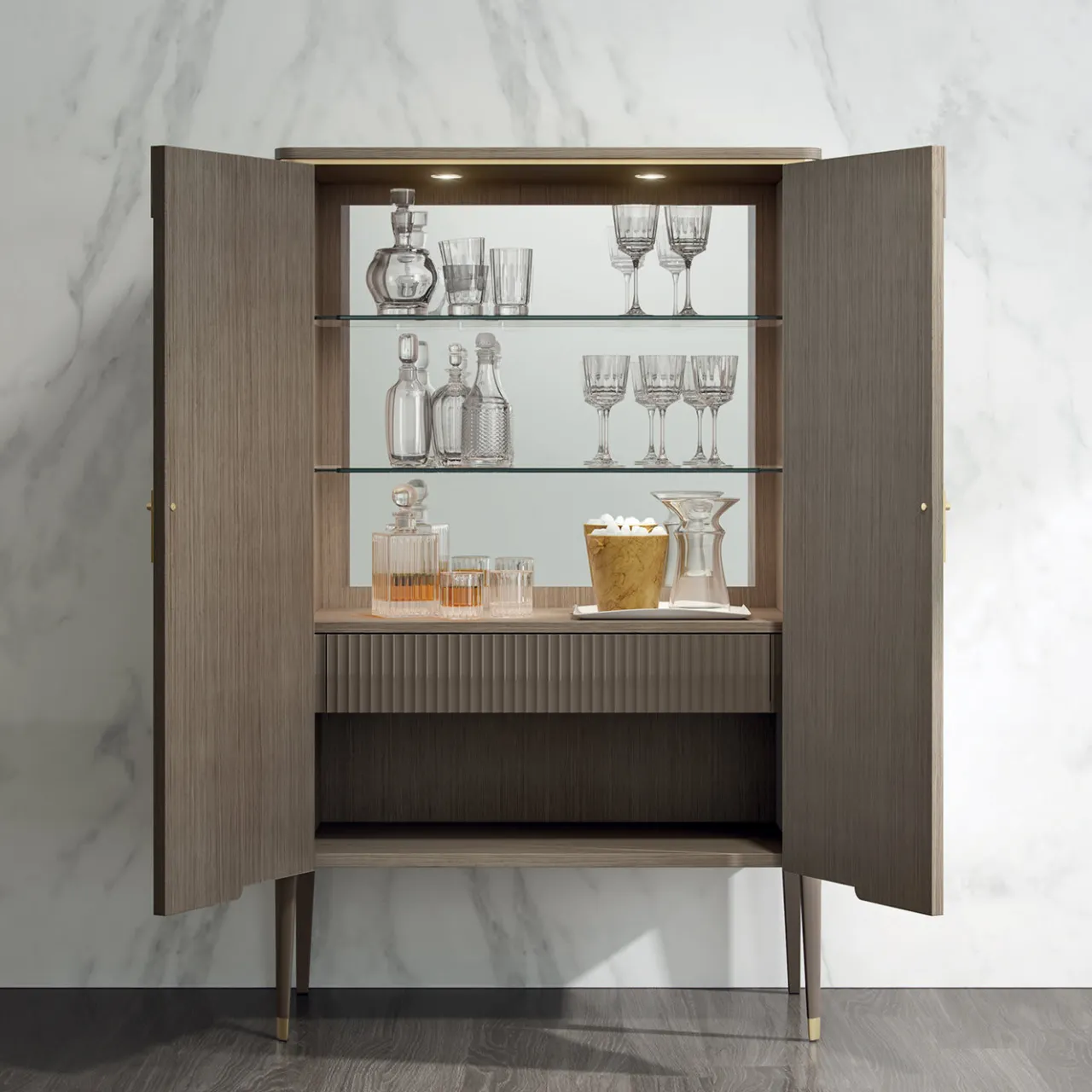 l bellissimo mix tra il legno naturale di noce e i dettagli in metallo galvanico dorato è perfetto per un ambiente contemporaneo e lussuoso. All’interno, uno specchio senza soluzione di continuità riflette la luce di una striscia luminosa a LED perfettamente inserita sotto il piano. Con i suoi ripiani e cassetti in cristallo, questo mobile offre un ampio spazio di archiviazione. Le maniglie sono rifinite in galvanica dorata, con il bellissimo logo “HC” inciso. Chiedete al Concierge le opzioni di personalizzazione.