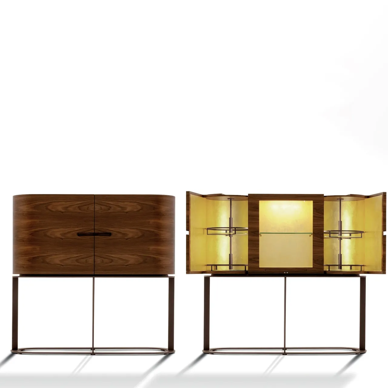 La massima raffinatezza si fonde con la tradizione artigianale secolare in questo splendido pezzo di arredamento funzionale: un mobile bar realizzato a mano in noce canaletto. Internamente in legno di sicomoro frisé laccato bianco, è composto da una serie di vassoi girevoli in metallo laccato bronzo, regolabili in altezza e dotati di ripiani in cristallo e luci LED. La base, pulita e sofisticata, è in metallo laccato bronzo.