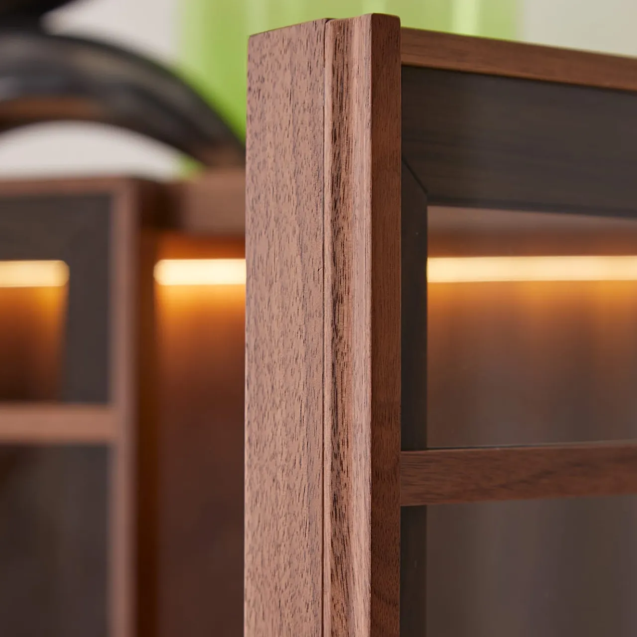 Mobile a tre ante in pregiato legno di Noce Canaletto; l’intero mobile è in legno impiallacciato in essenza di Noce Canaletto e parti in legno massello. I piedi sono cilindrici in metallo color bronzo e terminano con una punta in legno. Sono presenti tre ripiani interni in vetro ed è possibile inserire le luci a led su richiesta. L’apertura avviene tramite la maniglia integrata in legno massiccio. Sono disponibili vari colori. Tutto è costruito internamente nella nostra falegnameria in Italia.