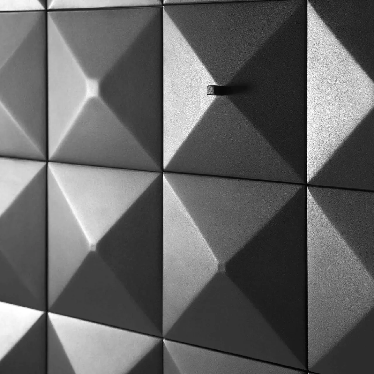 Questo mobile distintivo e ultramoderno è rivestito con piastrelle magnetiche piramidali di sezione 15×15 cm. Realizzato interamente in MDF laccato testurizzato, presenta 2 ante a battente, una fascia centrale fissa e ripiani interni. Il mobile si apre con un pomello ed è sostenuto da una base in metallo laccato nero di sezione 25×25 cm. Possibile fornitura del solo kit piastrelle.