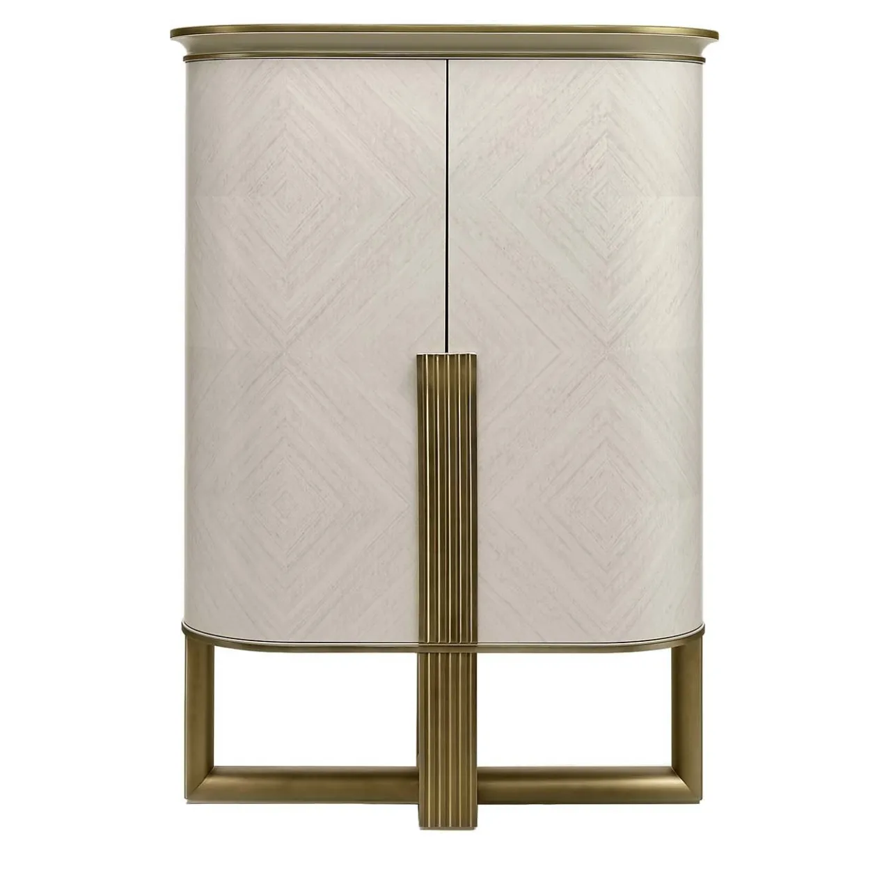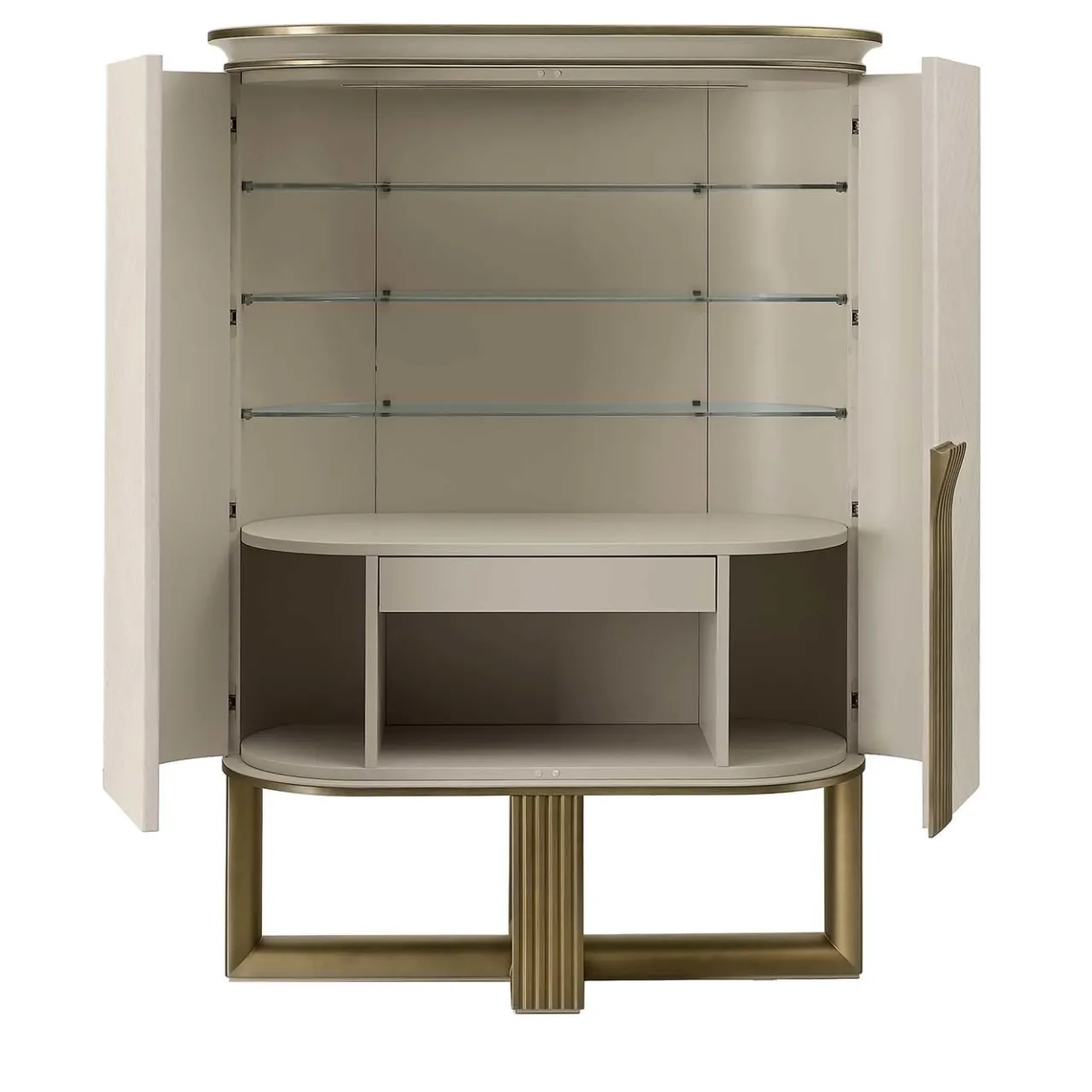 Parte di una collezione di mobili esclusivi e raffinati, questo mobile sarà il punto focale di qualsiasi riunione festiva. è squisitamente realizzato in legno. Sostenuta da una struttura in compensato e MDF rivestito di eucalipto bianco, la robusta silhouette è arricchita da dettagli in metallo color oro. Le due grandi ante si aprono per rivelare un interno raffinato, caratterizzato da tre ripiani in vetro e scomparti in legno per un look funzionale ed eclettico.