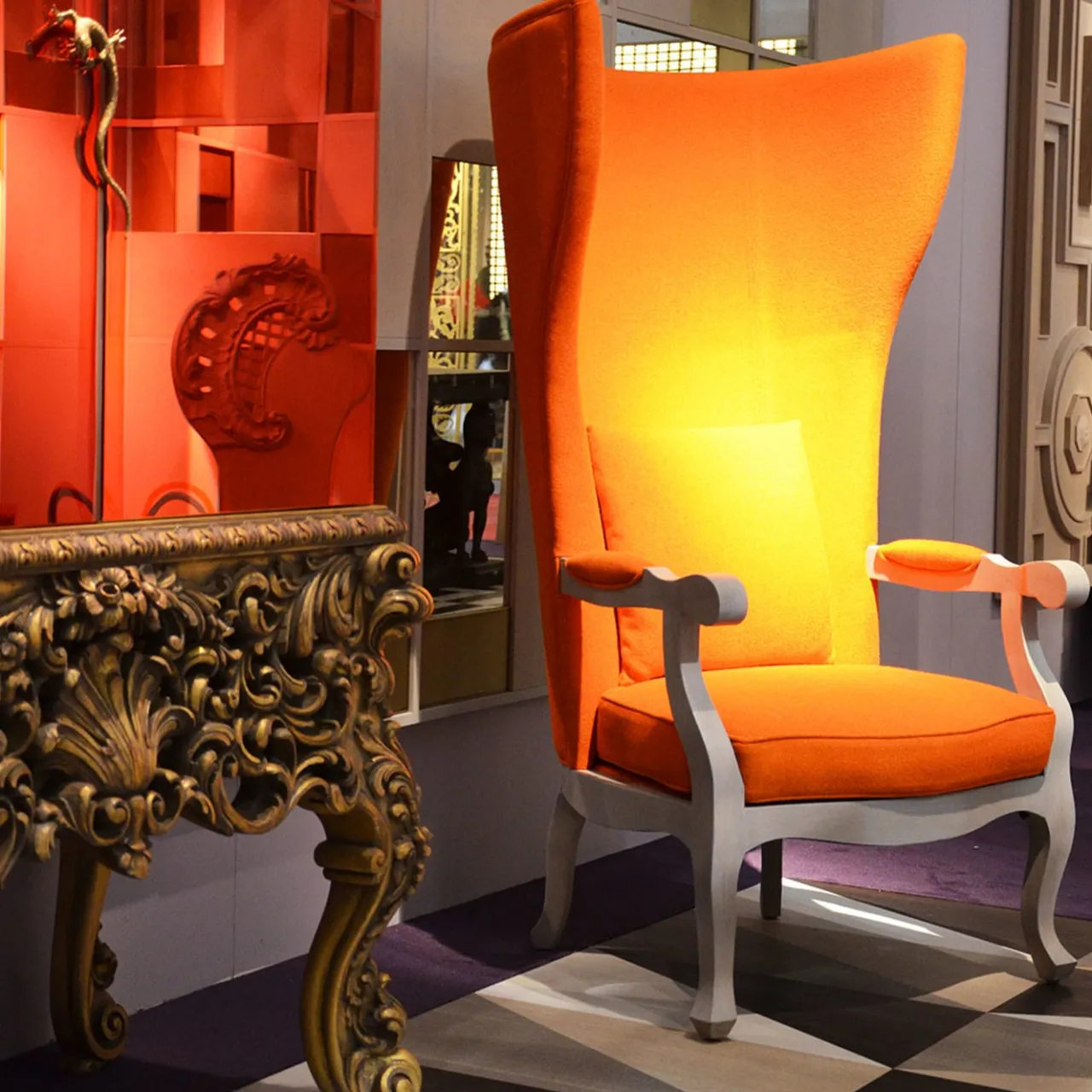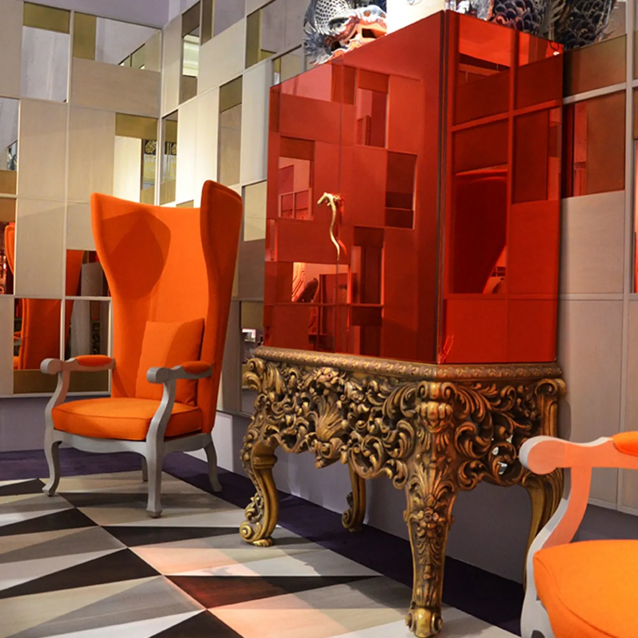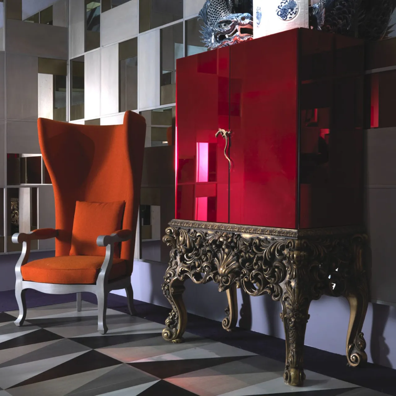 Abilmente intagliato in uno splendido design di sofisticato valore ornamentale, questo mobile sarà un’aggiunta maestosa e sontuosa a uno spazio interno elegante. Rifinito in oro antico, il basamento in legno sostiene il mobile a due ante, rivestito da uno specchio laccato arancio accostato all’interno laccato nero opaco, arricchito da ripiani in vetro nero. Disegnato da Ferruccio Laviani, si distingue per la maniglia in ottone a forma di geco.