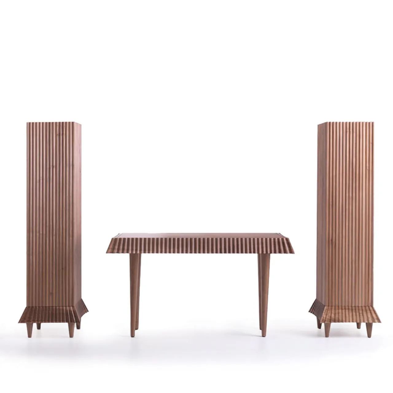 Questo splendido mobile alto fa parte di un’edizione limitata di 10 pezzi disegnati da Ugo La Pietra. La silhouette stretta di questo contenitore, realizzato in legno con finitura noce miele naturale, è messa in risalto dalla splendida texture della sua cornice esterna, ornata da una serie di scanalature verticali che corrono parallele dall’alto verso il basso e che sfociano in un piccolo decoro che evoca il tessuto. Questo raffinato oggetto d’arredo funzionale è dotato di un’anta frontale che si apre su uno spazio versatile con due ripiani in legno ed è completato da quattro corte gambe affusolate.
