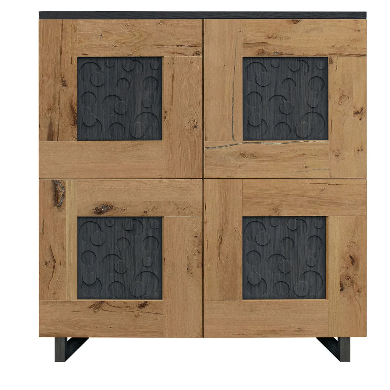 Questo mobile, che unisce eleganza minimalista e materiali raffinati, è realizzato in pregiato legno di frassino con finitura grigio cenere. Le quattro ante senza maniglia, incorniciate in rovere naturale, presentano dettagliati intagli in bassorilievo che ne esaltano l’estetica. La base scorrevole incassata garantisce stabilità senza appesantire il design. All’interno, i ripiani in legno offrono un pratico spazio di archiviazione. Perfetta per gli spazi abitativi o gli studi, combina un look elegante e moderno con una raffinatezza artigianale.