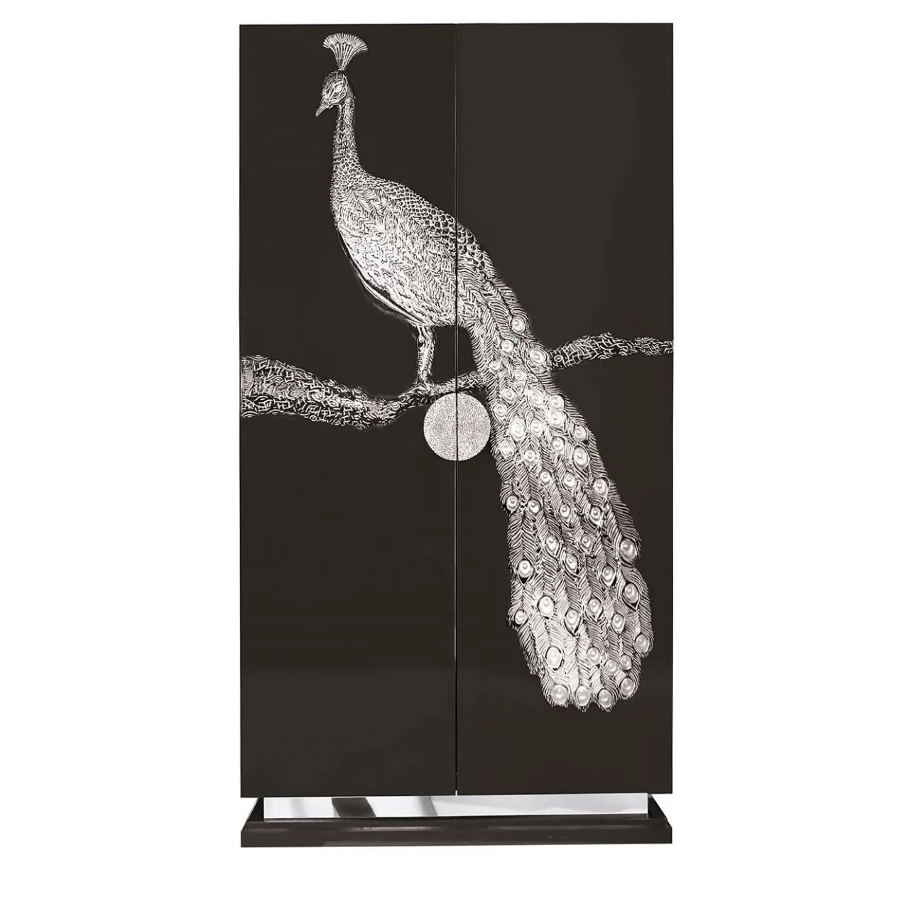Questo splendido mobile da cocktail combina elegantemente una finitura laccata nera lucida con dettagli in argento scintillante per creare un senso di elevazione e compostezza. Il mobile poggia su una base a plinto arricchita da un’ampia fascia d’argento e le due ante con maniglie semicircolari d’argento si aprono per rivelare un interno altrettanto lussuoso con dettagli d’argento e a specchio. Disegnato da Luca Radice, l’elemento distintivo di questo splendido pezzo è il grande pavone dipinto a mano, che gli conferisce una qualità stravagante.