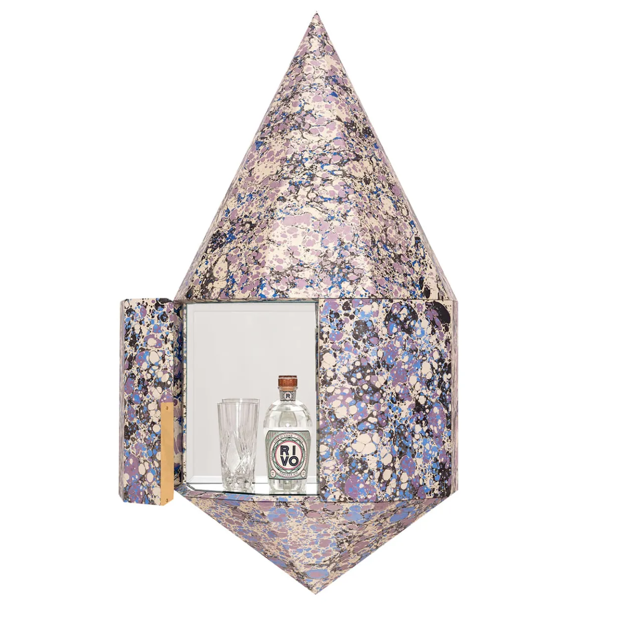 Questo elemento nasce dall’unione di riferimenti dal significato profondo: tabernacoli e pietre preziose. Realizzato in legno, è un mobile che vuole diventare il custode delle piccole gioie domestiche e dei riti quotidiani. L’esterno è rivestito di carta di cotone marmorizzata, realizzata a mano da esperti artigiani umbri, mentre l’interno è rivestito di ottone lucido e specchi, capaci di esaltarne il contenuto. Può essere declinato in molti modi, da altare domestico a mobile bar.