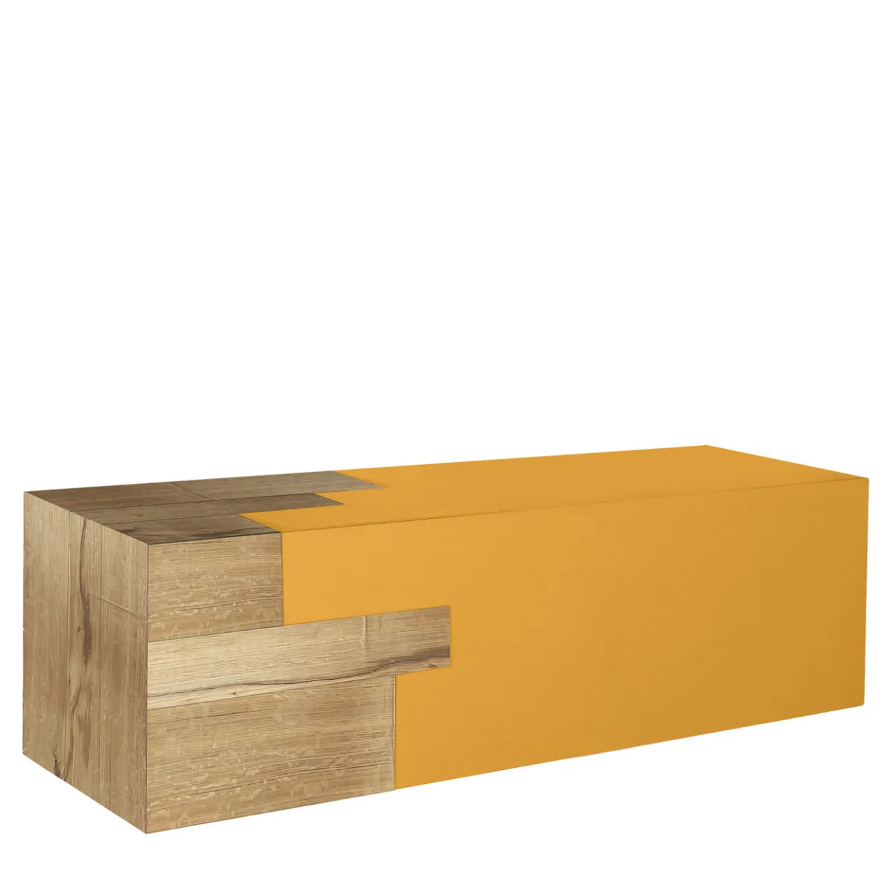 La raffinatezza contemporanea si fonde con un elegante tocco vintage in questo straordinario mobile sospeso orizzontale, un progetto esclusivo della Collezione Fiammifero disegnata da Giulia Contaldo. Prende il nome dalla parola italiana “fiammifero” ed è realizzato a mano in Valchromat giallo, una fibra di legno MDF, in parte rivestita in durmast naturale. Consultare il catalogo Artemest per i modelli disponibili di questa collezione.