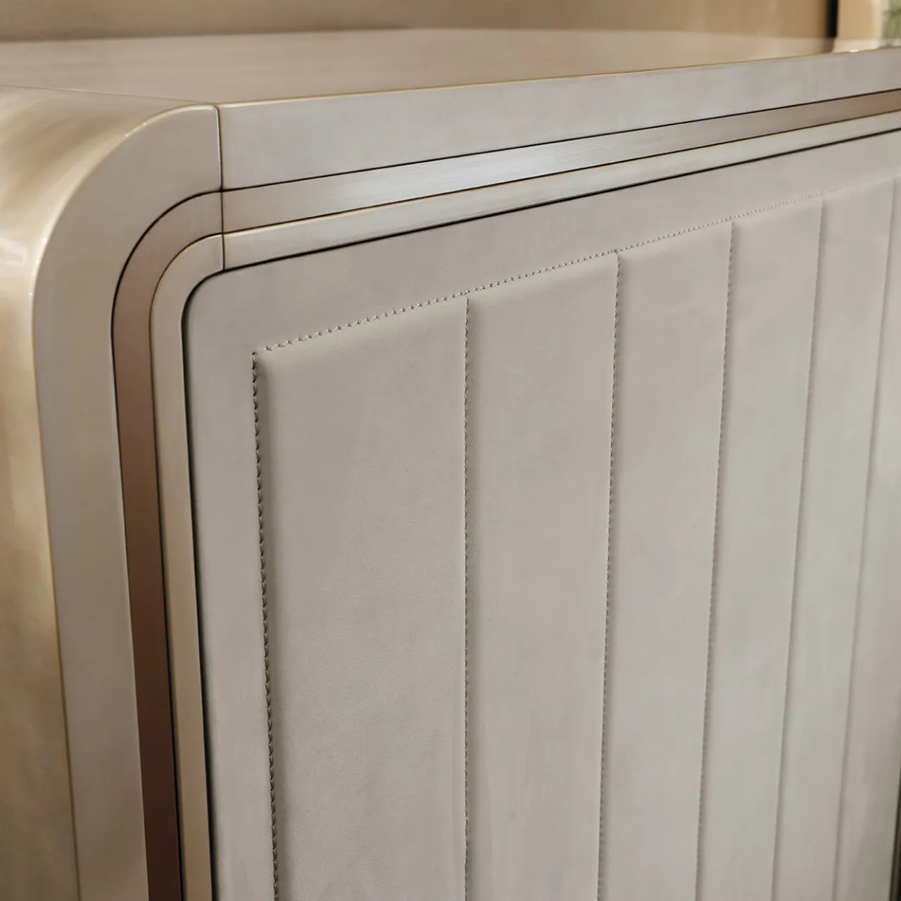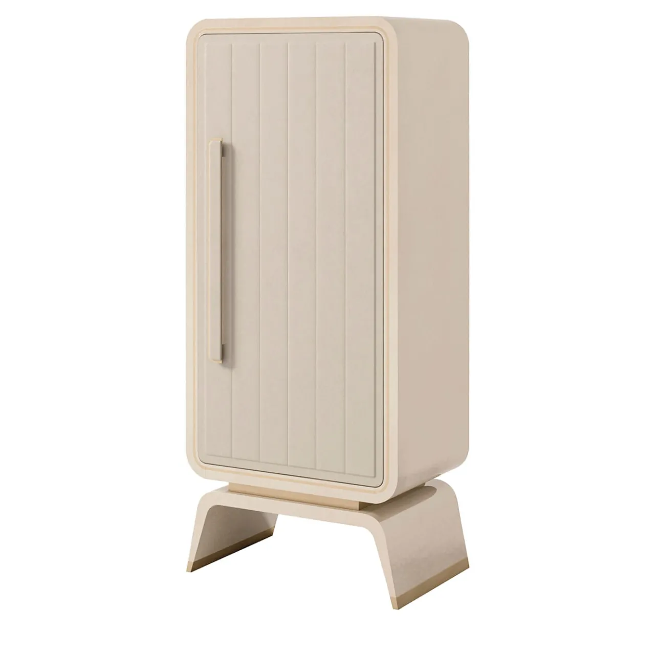 Raffinato e funzionale, questo piccolo armadio presenta una struttura in legno con finitura laccata lucida Pearl Champagne, impreziosita da dettagli in metallo satinato oro. L’anta frontale, rivestita in nabuk trapuntato, è abbinata a una maniglia in metallo e nabuk. All’interno, due cassetti con chiusura ammortizzata e divisori in econubuck. Disponibile con illuminazione a LED e con anta frontale laccata. Disponibile anche nella versione con anta sinistra. Finiture personalizzate disponibili, contattare il Concierge per i dettagli.