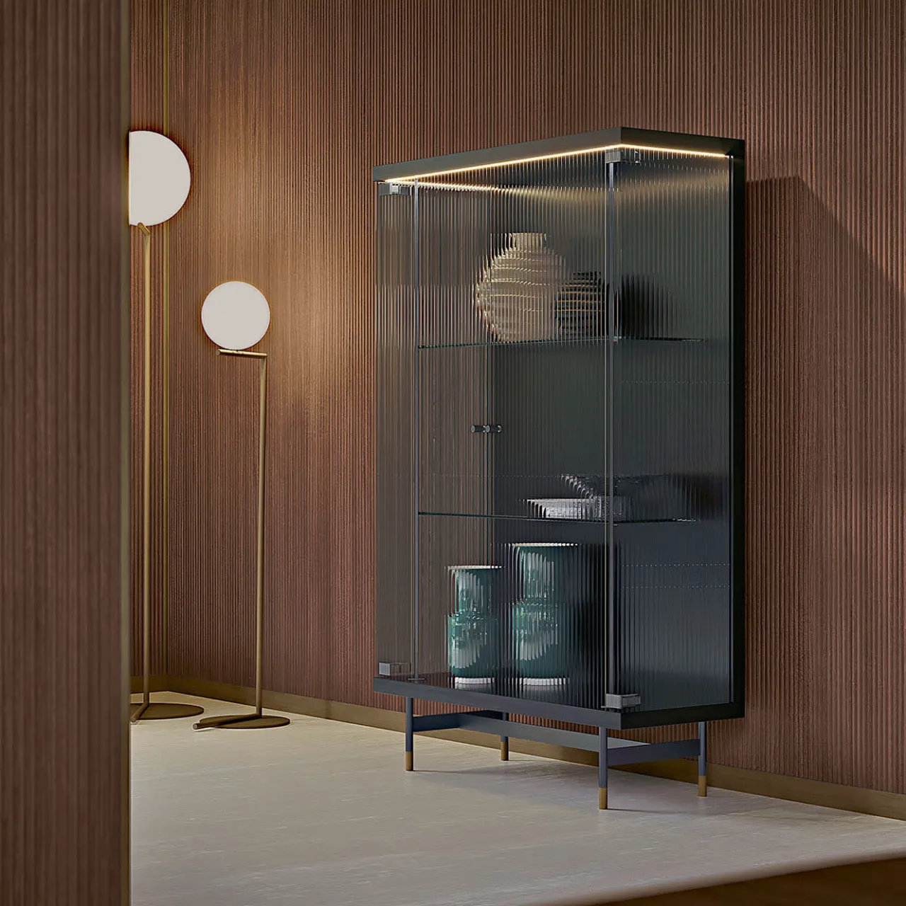 Con fianchi e ante in vetro dall’ipnotica texture canalizzata, questo mobile è un prezioso elemento d’arredo in cui la poesia dei riflessi della luce incontra l’affidabilità di un robusto guscio in noce americano. Una semplice base in metallo con piedini in ottone brunito sostiene la struttura, sormontata da un piano St Denis Shiny e dotata di strisce LED interne per una sensazione di intimità. Contattare il Concierge per conoscere le varianti disponibili.