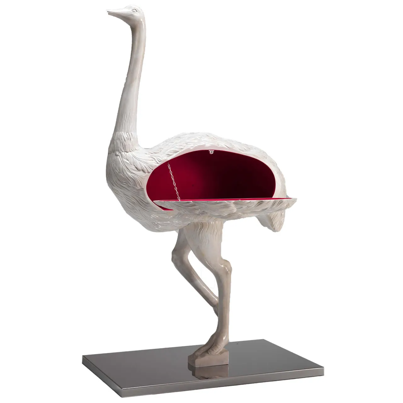 Lizzy, più che un mobile, è un capolavoro in legno intagliato a mano con uno stravagante struzzo. Poggiato su un piedistallo in acciaio inox a specchio, è un sofisticato mobile bar o una meraviglia scultorea che aggiunge estrosità e lusso alla stanza. Meticolosamente realizzato, l’interno di Lizzy è laccato rosso cardinale, che completa l’eleganza dello struzzo intagliato a mano, mentre l’esterno laccato bianco pergamena lucido crea un contrasto visivamente accattivante.