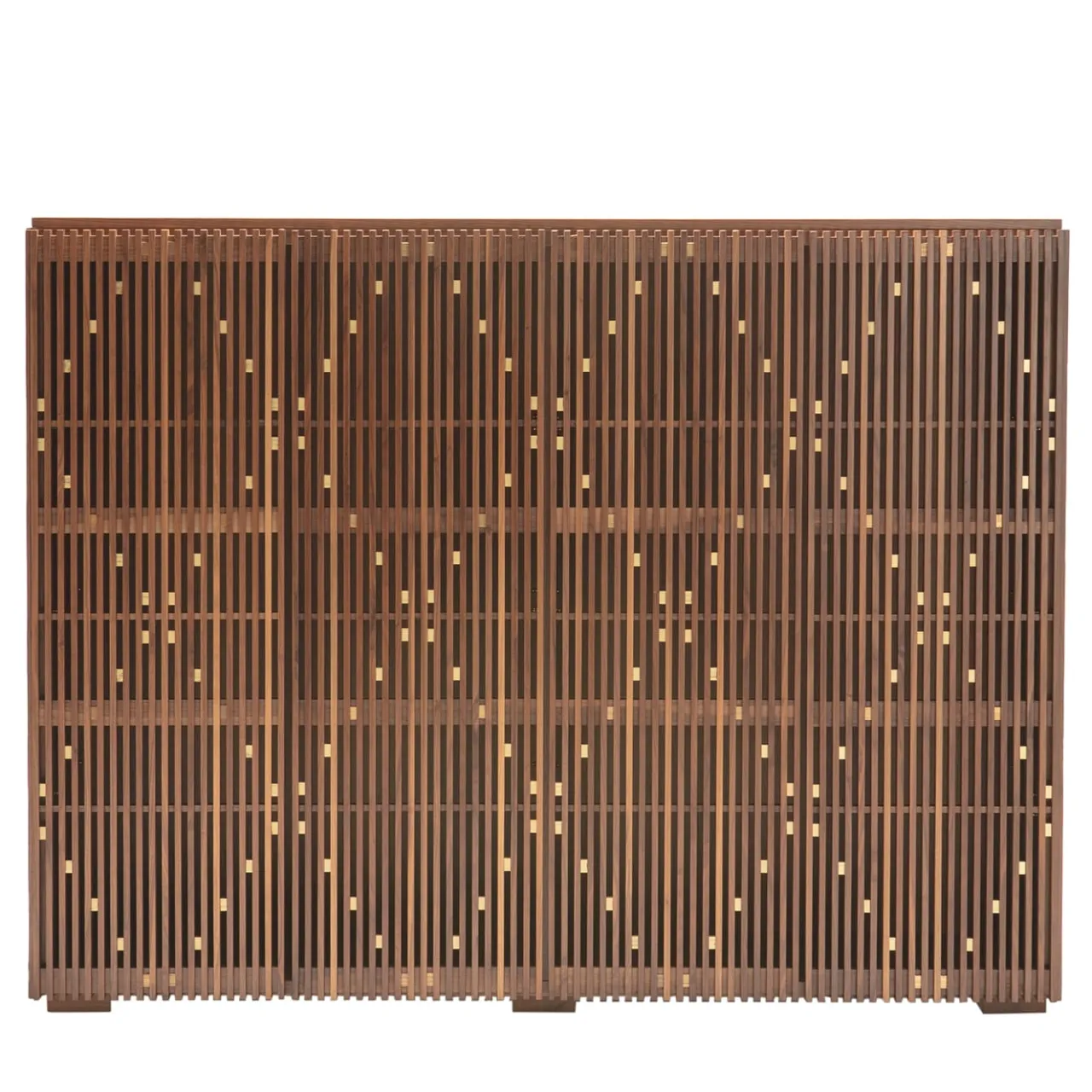 Mobile Milione in noce canaletto con piano in ottone. Lavorazioni: struttura esterna in listellare impiallacciato in noce canaletto – ante in massello di noce con inserti in ottone a formare la caratteristica principale di Milione, le figure romboidali. All’interno 2 ripiani a tutta larghezza in vetro temperato extrachiaro da 2 cm. Per ulteriori opzioni, rivolgersi al Concierge.