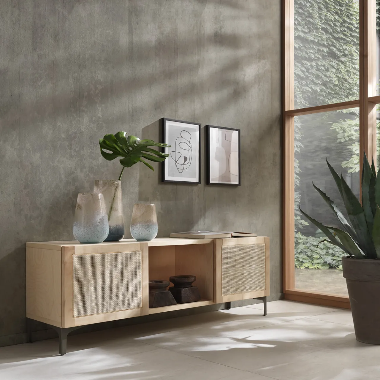 Linee pulite e preziosi dettagli artigianali sono i tratti che conferiscono a questo elegante porta TV un fascino senza tempo. Realizzato a mano in frassino massiccio e poggiato su piedini in metallo color antracite, offre un ampio spazio contenitivo con il mobile centrale a giorno affiancato da una coppia di mobili chiusi dotati di ante in vimini traforato. Un trattamento finale ad acqua protegge la struttura senza alterarne l’aspetto naturale.