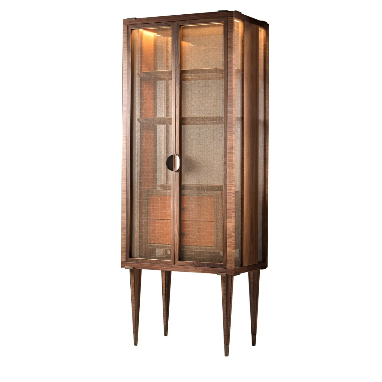 Disponibile anche nella versione con mobile a giorno, questo raffinato mobile si inserisce in modo superbo in qualsiasi interno moderno grazie al suo design all’avanguardia. La solida struttura in noce canaletto con dettagli in bronzo poggia su quattro gambe affusolate ed è caratterizzata da ante e sezioni laterali in vetro stratificato con una rete metallica in finitura bronzo. Il vano interno è dotato di due pratici cassetti in pelle.