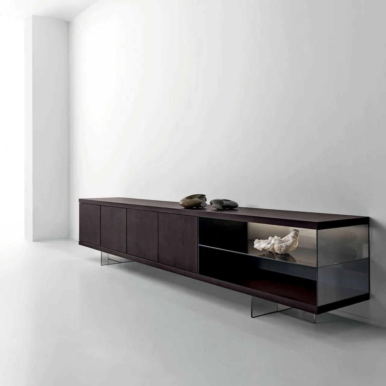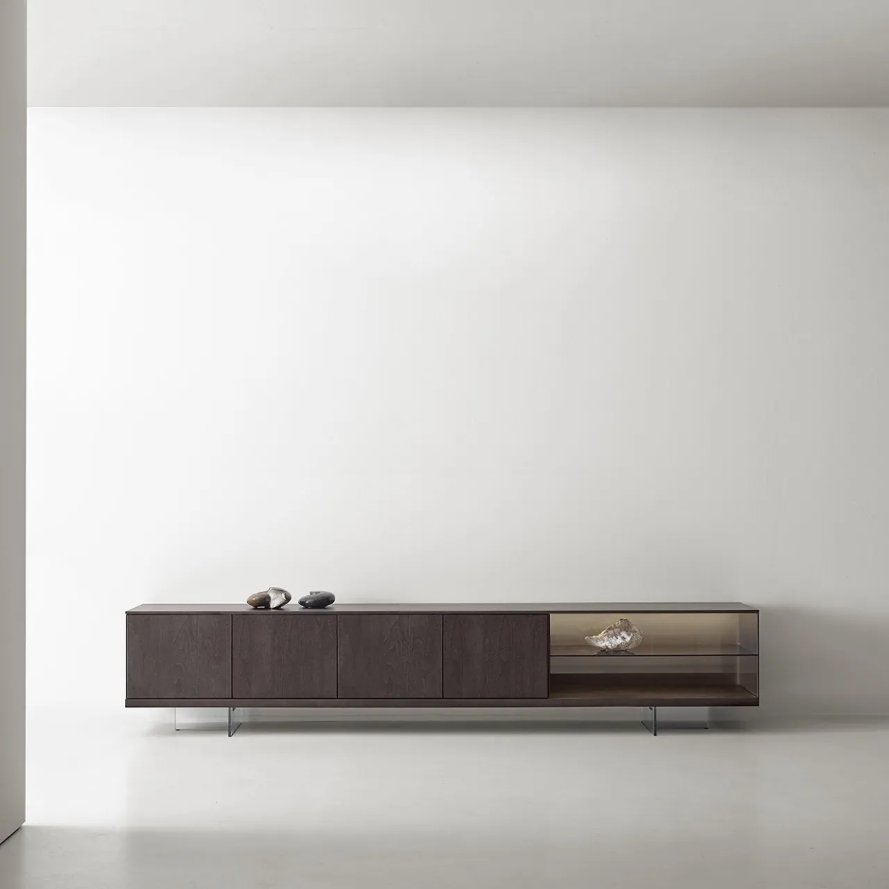 Definita dal suo profilo elegante, questa base TV combina funzionalità e materiali sofisticati. Realizzata in noce nero cioccolato con finitura ad acqua, vanta quattro scomparti e una vetrina in vetro fumé. Una discreta luce LED incorporata valorizza l’interno dell’espositore, creando un ambiente raffinato ideale per esporre oggetti decorativi. Il design elevato è completato da piedini in vetro minimalisti, in equilibrio tra modernità e fascino senza tempo.