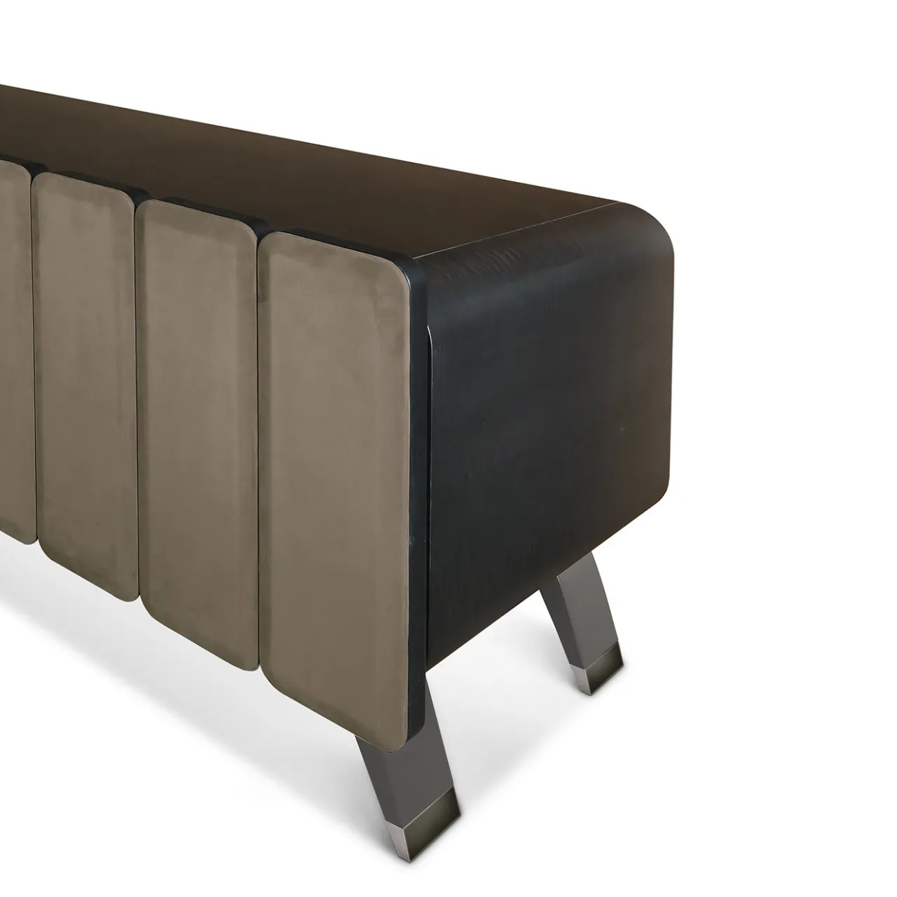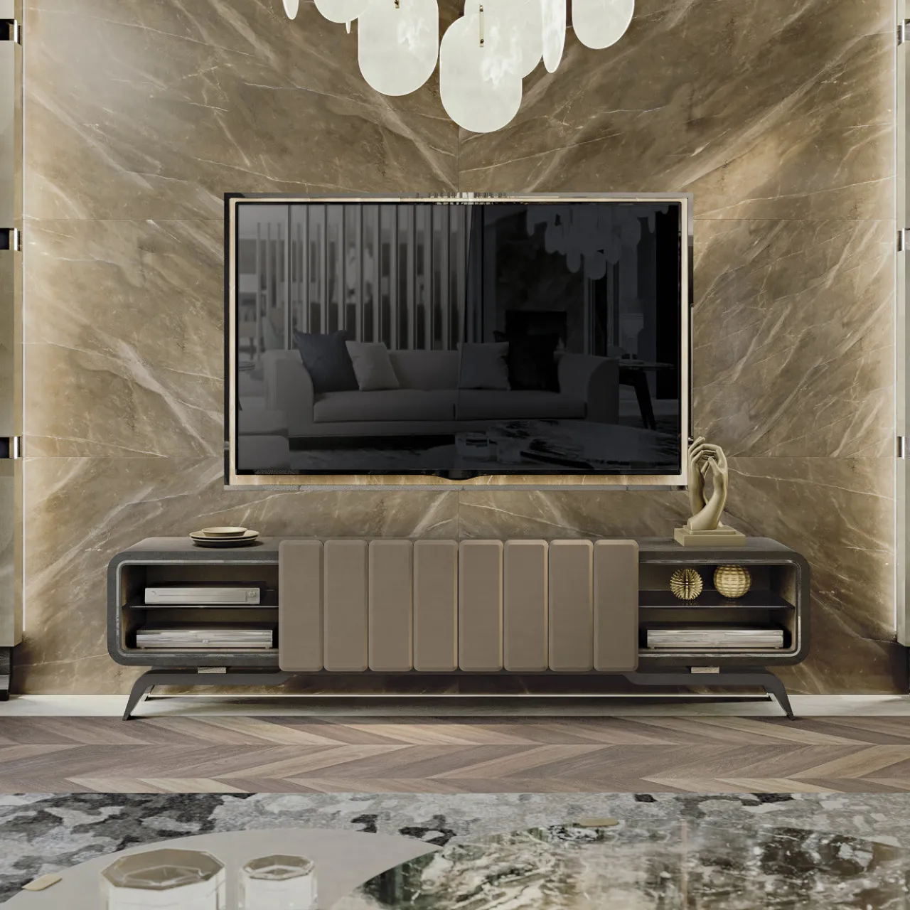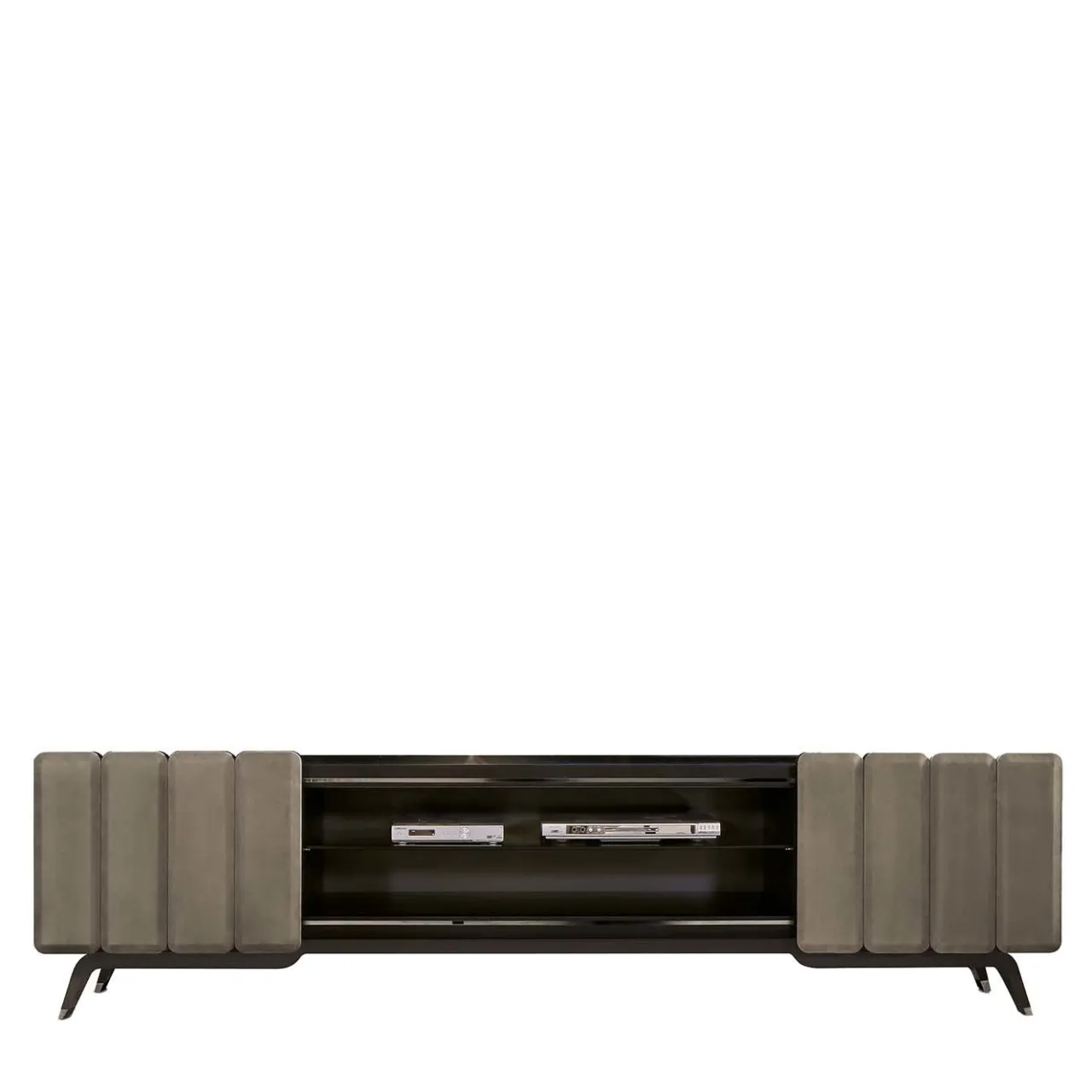 L’unità TV Hanami Soft Style consente di esporre il televisore in uno stile elegante. Il mobile, che poggia su gambe in metallo, è dotato di due ante scorrevoli con chiusura ammortizzata e pannelli in nabuk smussato. Il mobile è completato da un’impiallacciatura a scelta, qui rappresentata in Acero Frisé con finitura laccata opaca Umbra Gray.