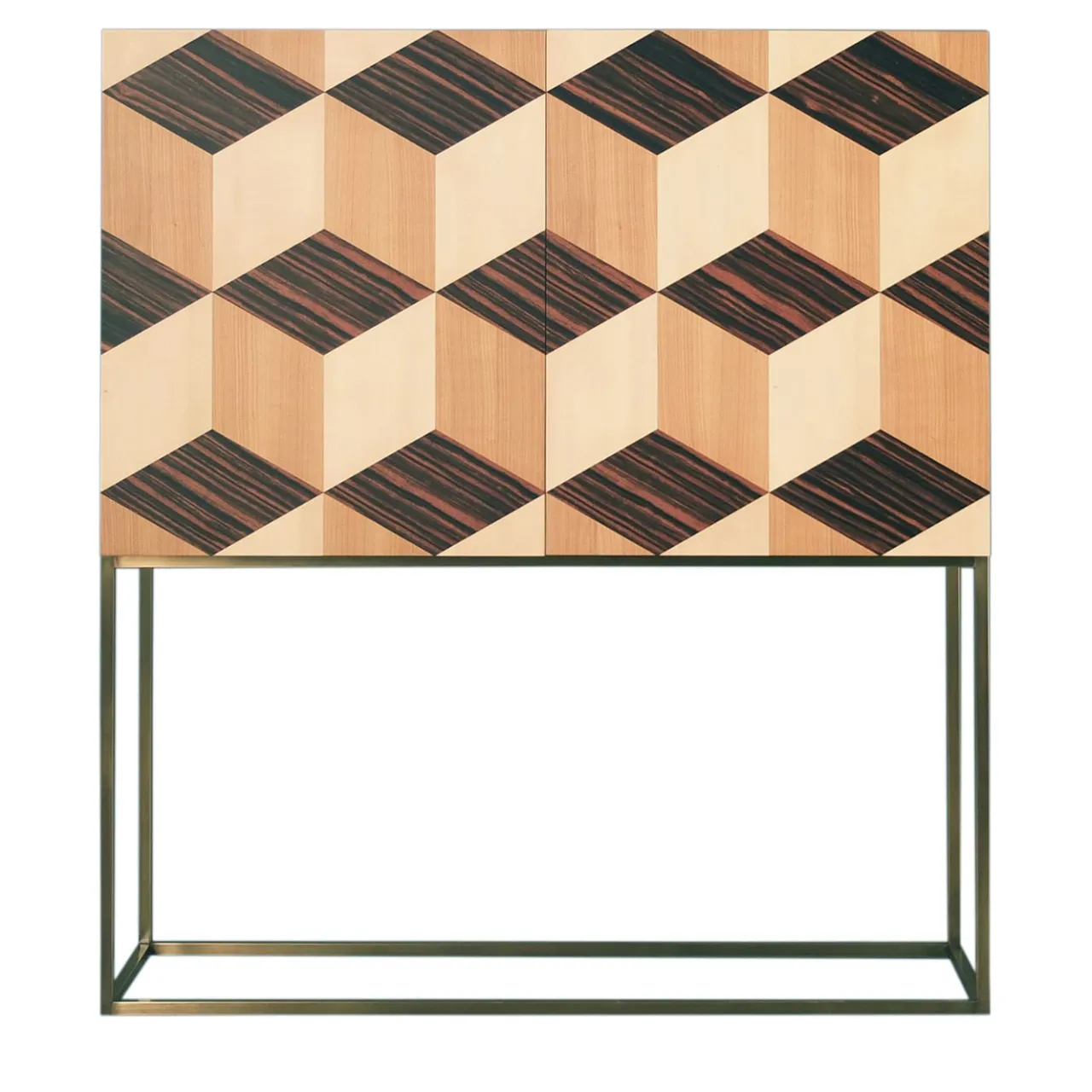 Veronese è una collezione personalizzabile di credenze e mobili da bar, disegnata dal Centro Ricerche MAAM. Caratterizzato da intarsi geometrici in ebano, acero e ciliegio, questo mobile in frassino presenta un design ispirato all’arte veronese del XV secolo. Comprende 2 ante, un interno colorato con 4 ripiani in vetro e una base in ottone.