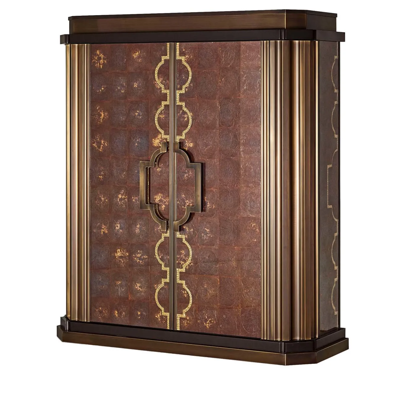 Un marchio che dimostra ancora una volta la sua singolarità, esaltando la sua creatività e l’uso sapiente delle tecniche di lavorazione. Questa struttura è realizzata con pannelli di legno, dove il fronte e il fianco sono decorati con piccoli inserti di mosaico, mentre lo specchio è in foglia di bronzo. La maniglia in ottone brunito presenta piccoli dettagli in mosaico.