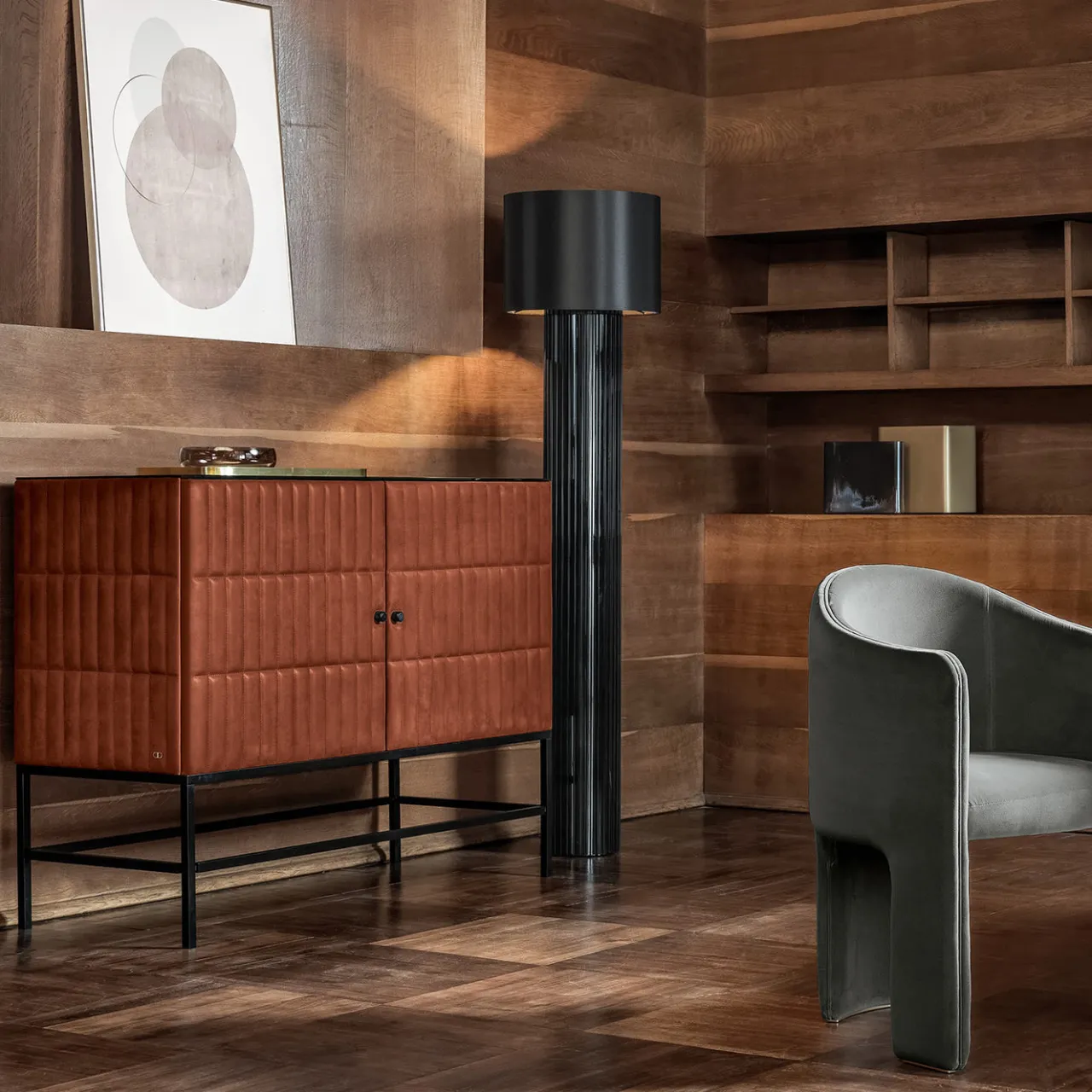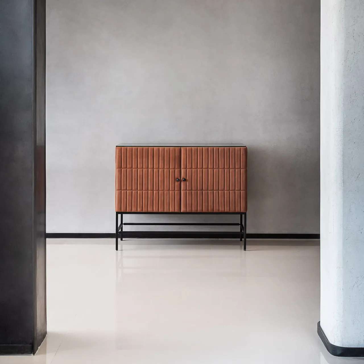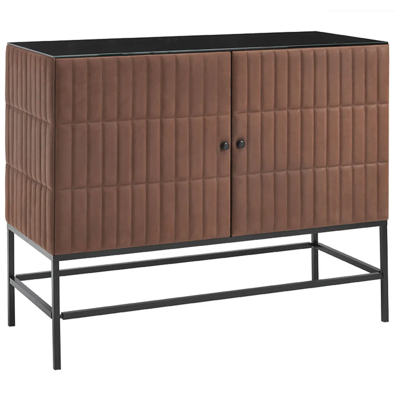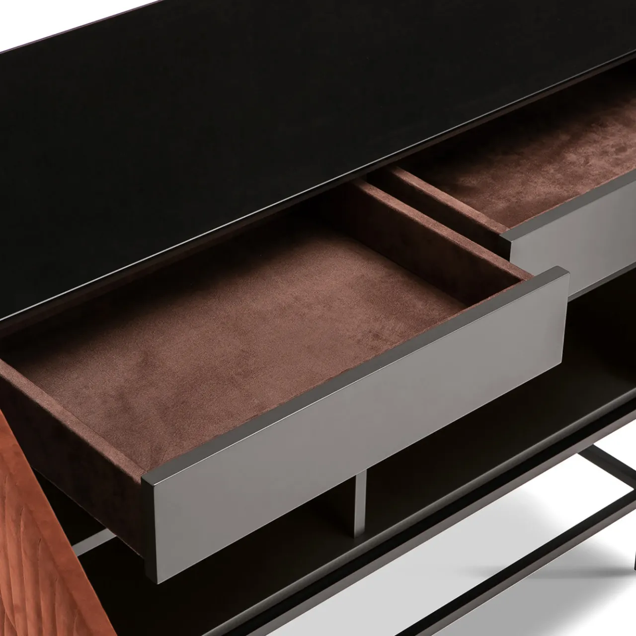 Questo raffinato pezzo presenta una struttura in compensato rivestita in pelle pregiata, completata da un interno laccato opaco con ripiani in legno. Il piano è realizzato in elegante vetro laccato nero e poggia su una base in acciaio con finitura nera opaca. I cassetti interni sono imbottiti e presentano una morbida fodera blu, con un meccanismo push-pull per una facile apertura e chiusura. Una fusione perfetta di lusso e funzionalità per gli spazi moderni.