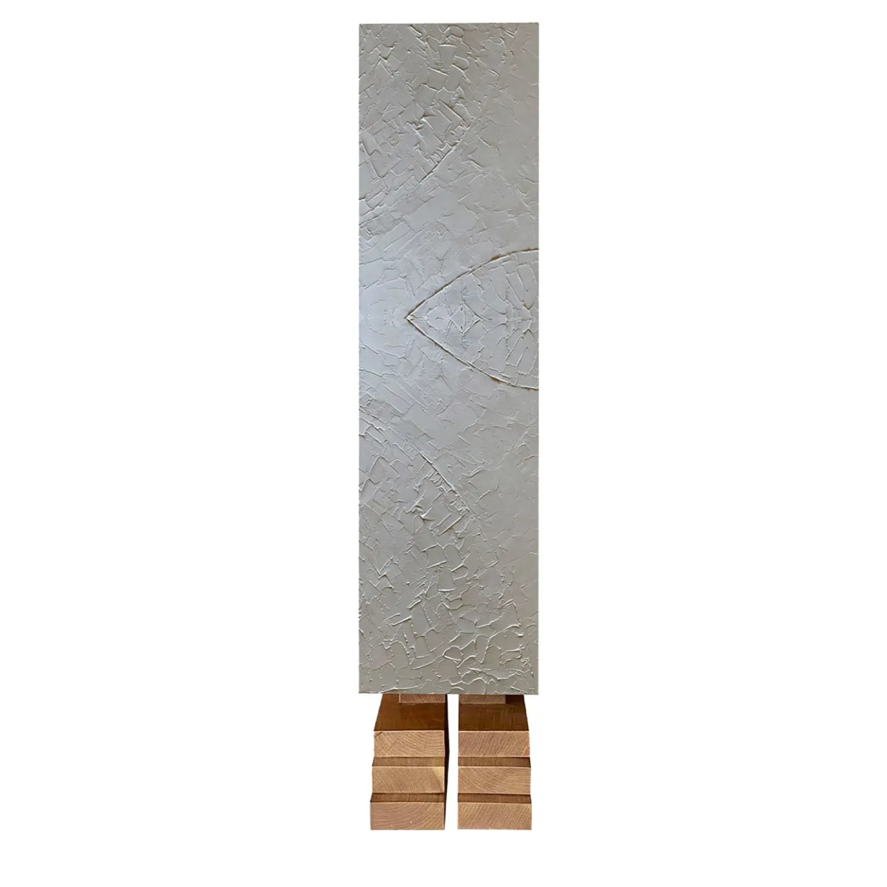 Pietro Meccani ha progettato questo mobile pensando ai totem indigeni, reinterpretandone il design in un pezzo audace che poggia su piedi di ciliegio a gradini e si distingue per l’irripetibile decorazione in gesso grigio ottenuta con una spatola. L’imponente struttura, ottenuta dalla combinazione di larice europeo e acero, si apre per rivelare due pratici ripiani. Il suo fascino è quello di un oggetto d’arte.