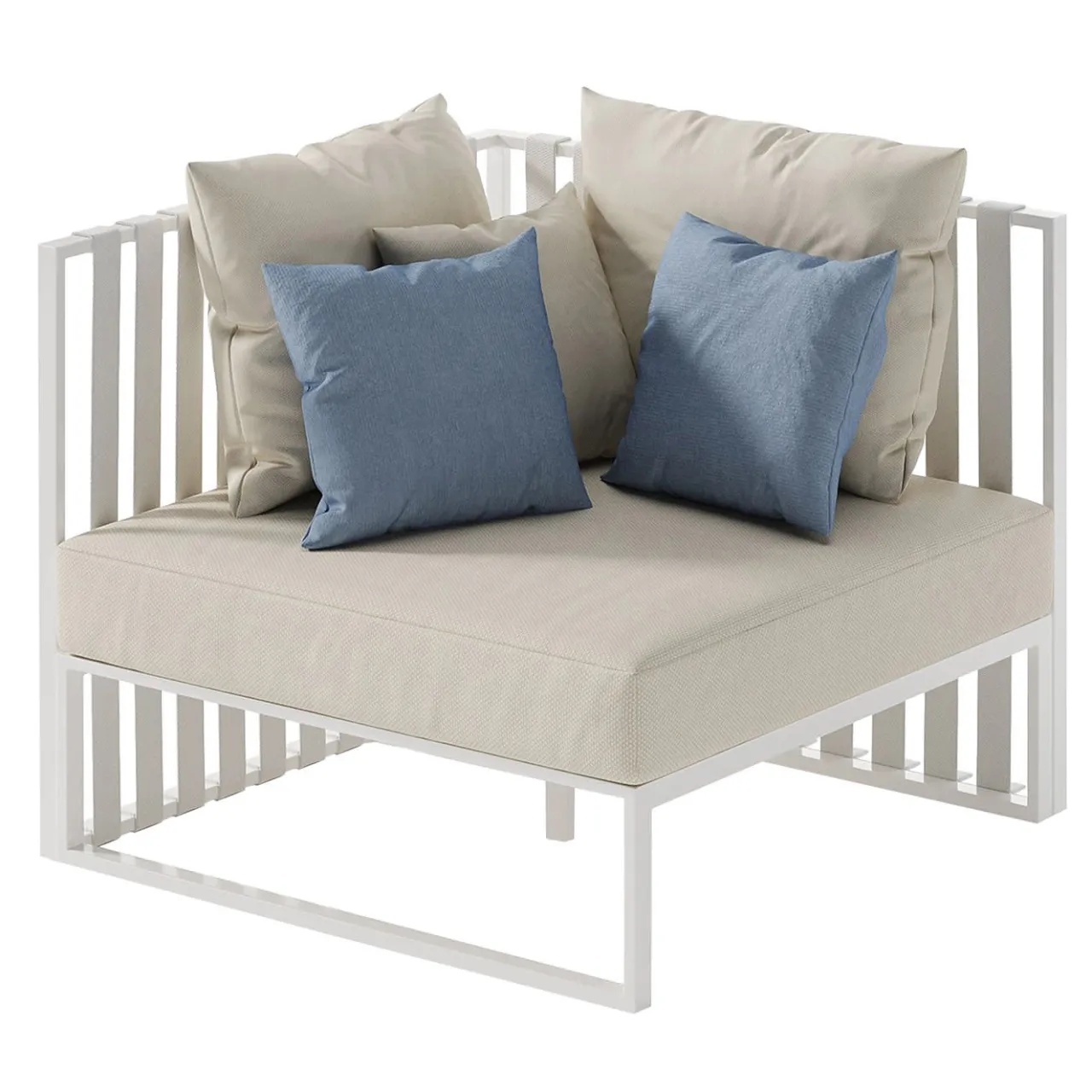 Profili affusolati che delineano i volumi in una sapiente distribuzione tra pieni e vuoti descrivono l’aspetto arioso di questo progetto, la cui seduta angolare sinistra fa parte di un sistema di sedute più ampio. Appartenente alla Metropolitan Collection per i suoi riferimenti urbani, presenta una struttura in alluminio verniciato a polveri epossidiche e cinghie in poliestere. Inclusi cuscini di seduta, 2 cuscini 60×60 cm, 1 cuscino 50×50 cm. Tessuto categoria B.