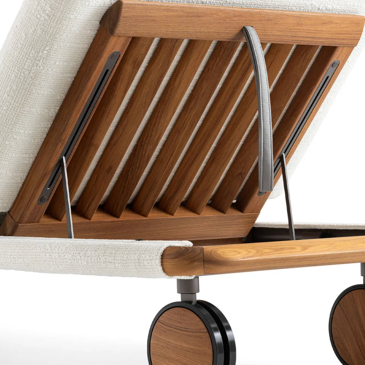 Il lettino prendisole Moorea presenta una strutturs in acciaio inox verniciato Pewter e inserti in legno massello di teak, progettato per resistere agli agenti atmosferici e all’umidità. Include cuscini in gomma drenante per una maggiore durata e comfort. Rivestito con tessuti della collezione open-air, il lettino offre una reclinazione regolabile per un relax versatile e due ruote posteriori per una facile mobilità. Il suo design raffinato è adatto a ambienti esterni di alta classe.