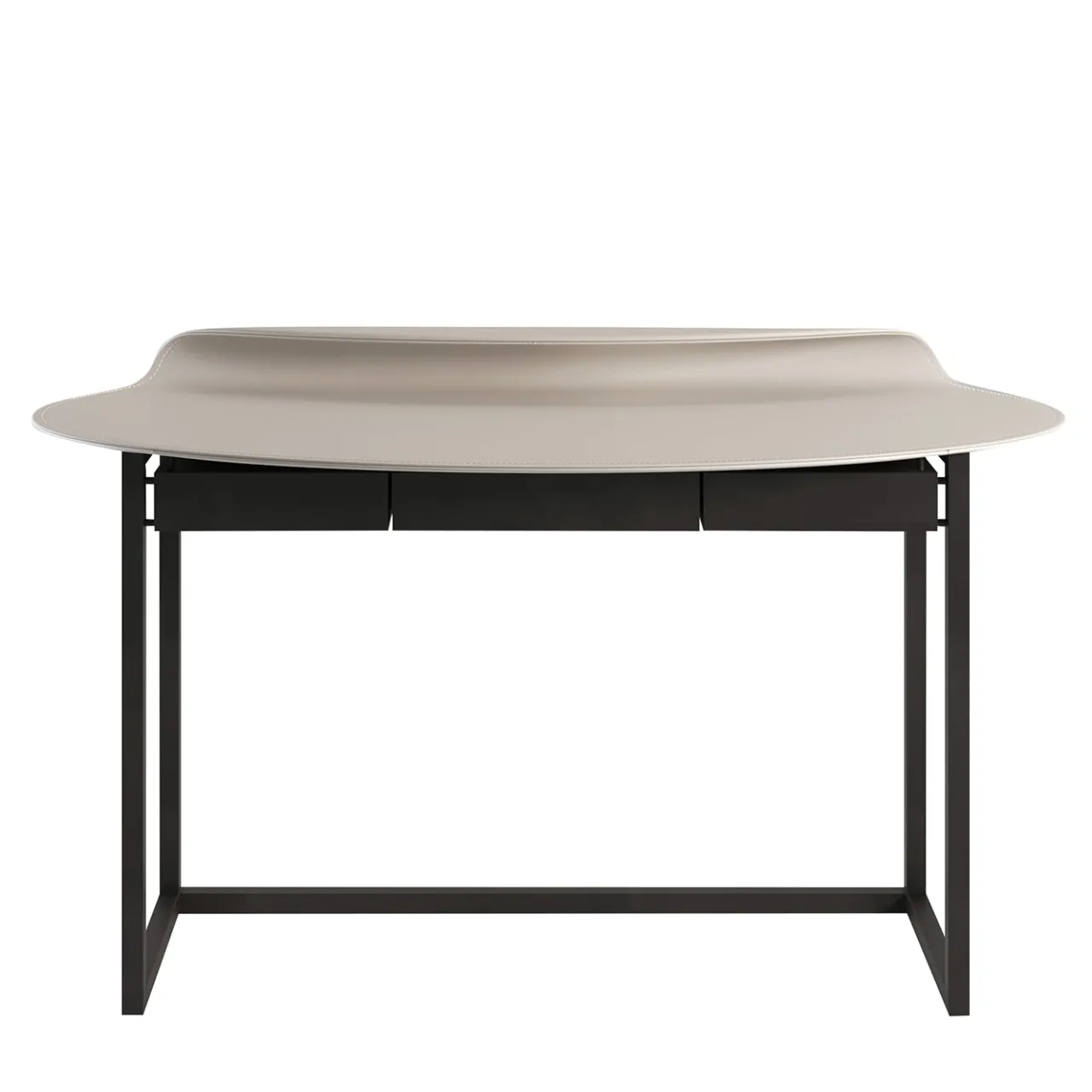 Nakamura Desk, progettata da Artefatto Design Studio, esplora le possibilità e la precisione dell’arte della lavorazione del cuoio. Tale versione che include i cassetti, è realizzata in pelle bianca Special e presenta una struttura in metallo laccato opaco Jet Black. Due pezzi di cuoio si curvano attorno al piano del tavolo, incontrandosi in una sola linea continua. È disponibile in diverse opzioni di cuoio e con o senza cassetti.