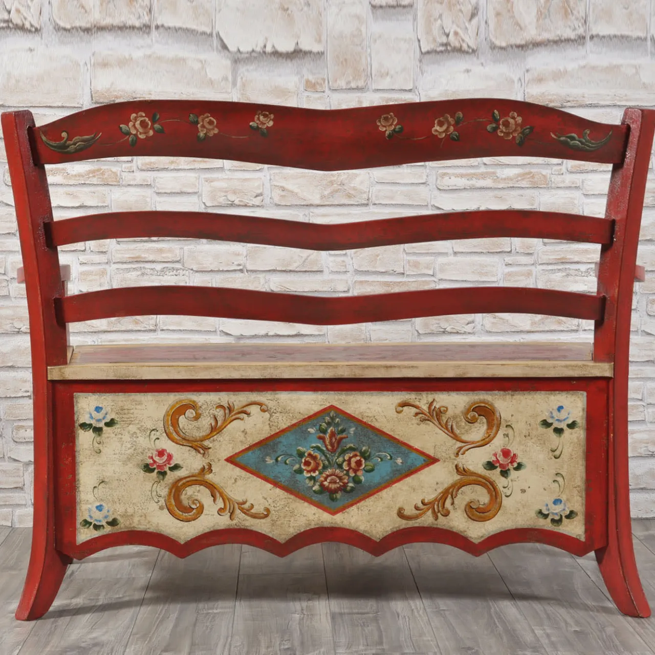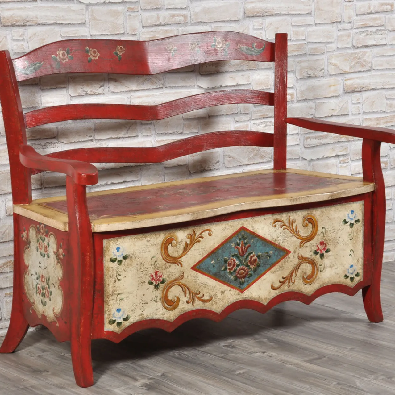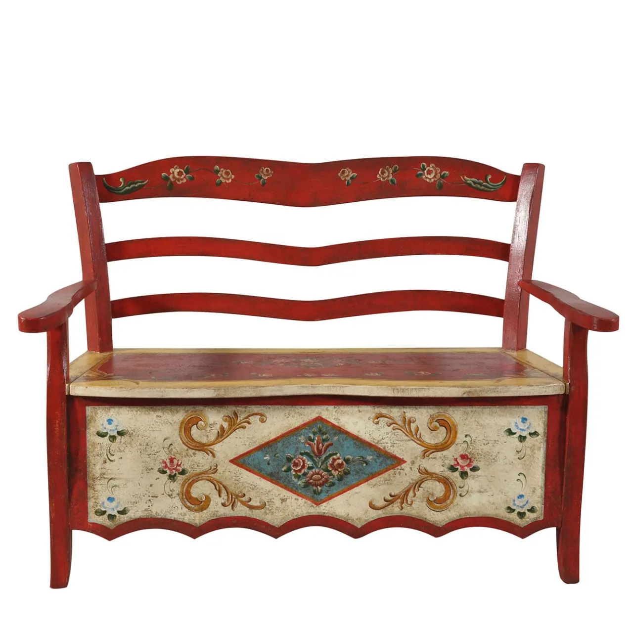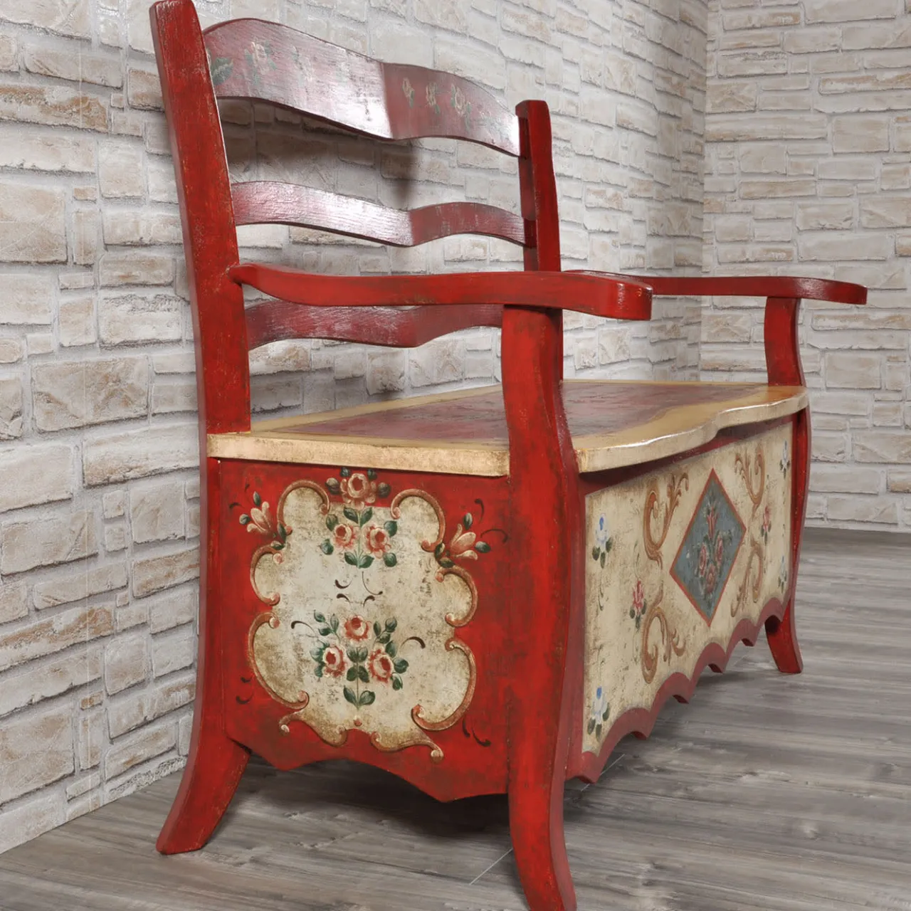 Forme eleganti arricchite da minuziose decorazioni dipinte a mano caratterizzano questa singolare panca contenitore in legno di tiglio, un pezzo prezioso che si ispira ai disegni tipicamente prodotti in Trentino Alto-Adige alla fine del XVII secolo. Le sue tonalità vivaci sottolineano l’impatto decorativo rendendolo un originale pezzo indipendente al centro di una stanza. Per richieste di personalizzazione, rivolgersi al Concierge.