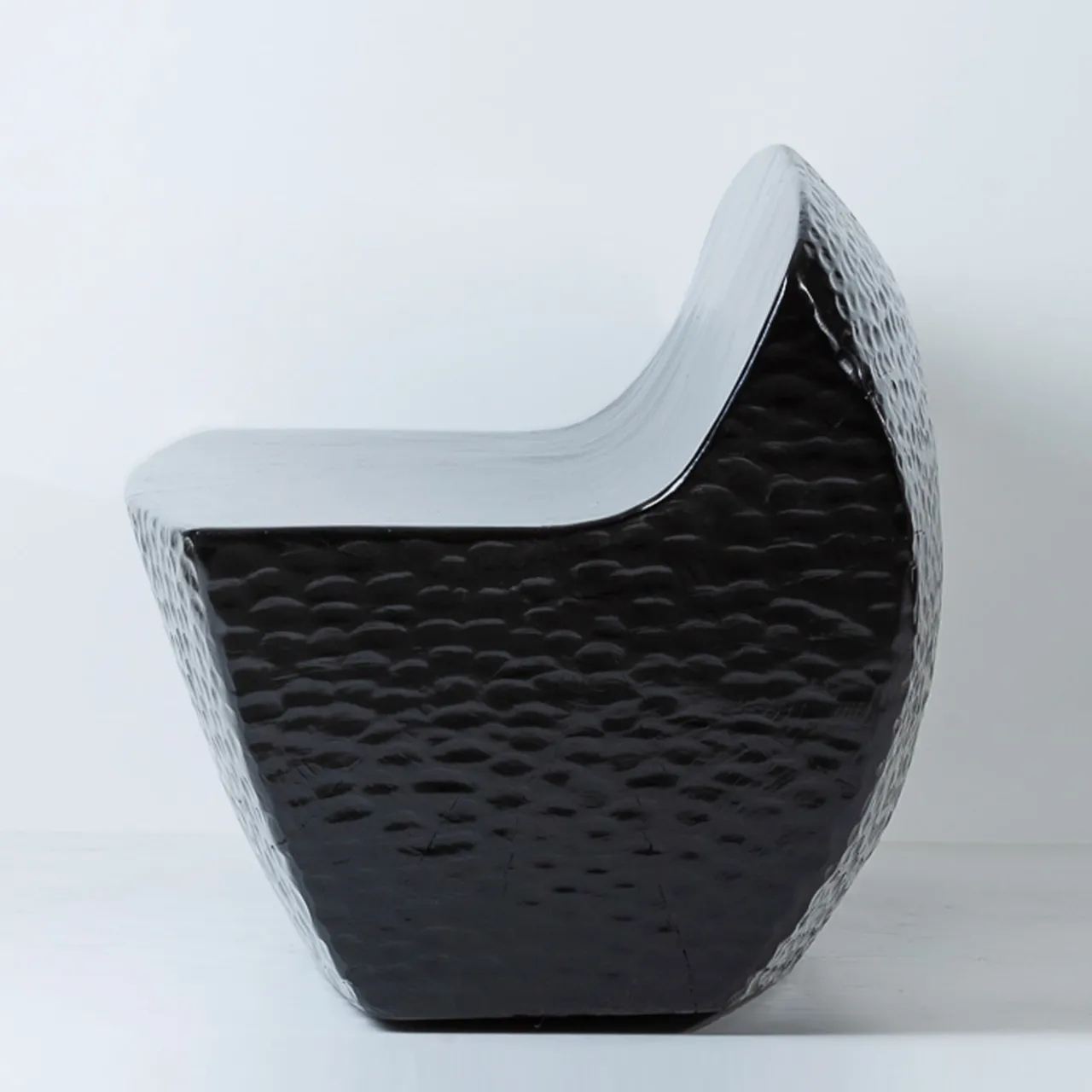 Una vetrina di instancabile artigianato, questa panca è stata scolpita da un singolo ceppo di cedro e tinta di nero per una dichiarazione cromatica di classe senza tempo. La sua silhouette dinamica si distingue per la forma fortemente svasata, impreziosita da una texture minuziosamente intagliata a mano lungo la base per aumentare il fascino tattile e visivo. È un pezzo unico che testimonia il fascino innato delle forme organiche.