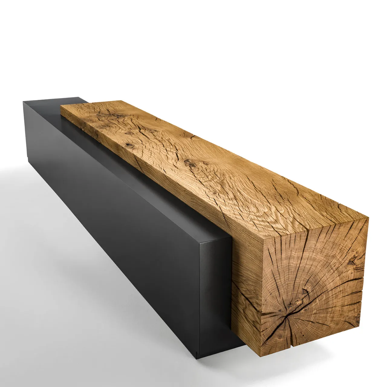 La panca Ombra presenta un design composto da due parallelepipedi integrati, che evocano il dialogo tra un oggetto e la sua ombra. È realizzata unendo un blocco in legno massello di cedro a sezione quadrata con un elemento in ferro ottenuto da lamiera piegata, rifinito con una laccatura opaca. Questo pezzo bilancia la texture naturale del legno con la matericità industriale del metallo, esprimendo un’estetica minimalista e contemporanea. Design di Hikaru Mori.