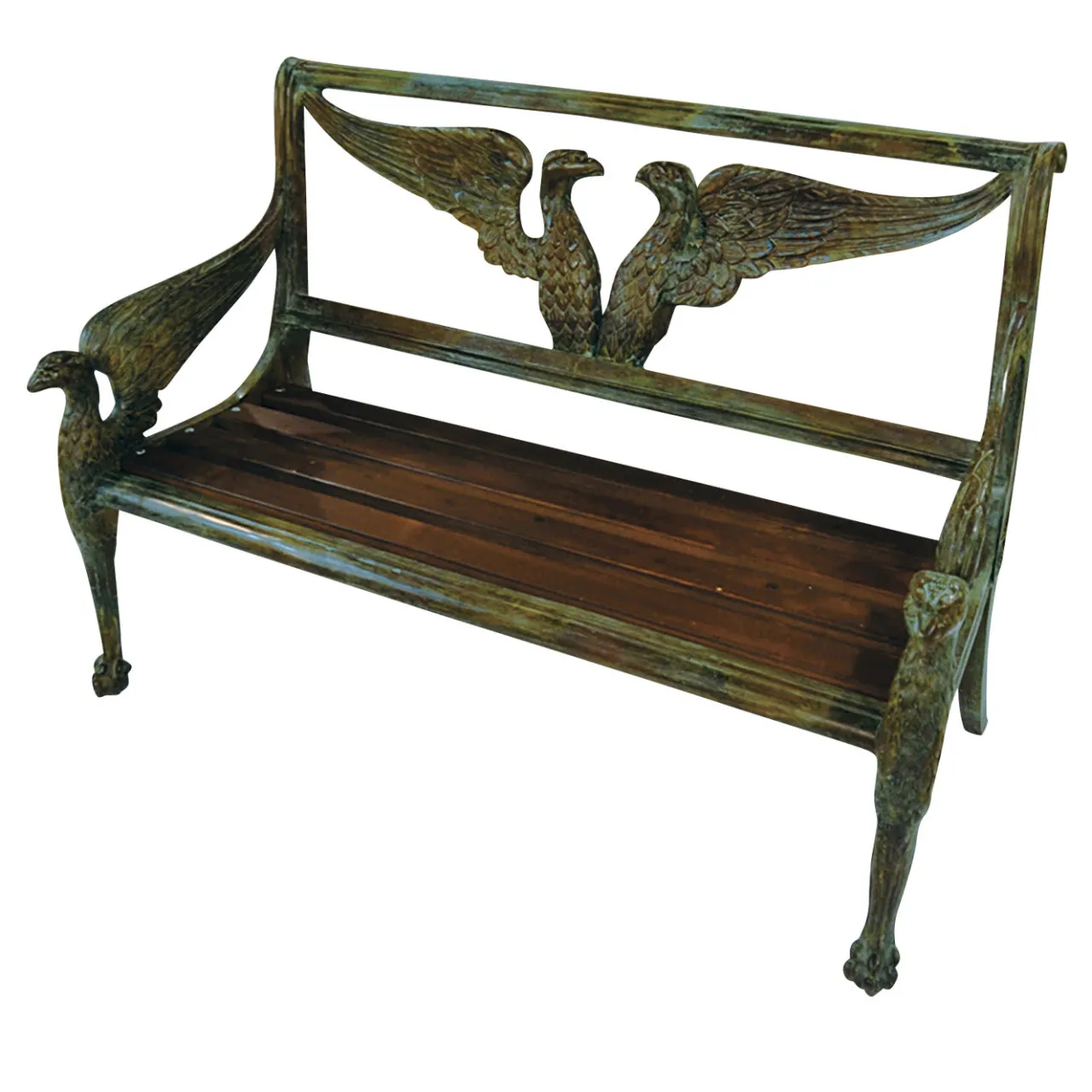 Questa squisita panca presenta una seduta in legno e una struttura magnificamente eseguita in bronzo con la tecnica della cera persa. Le due gambe anteriori hanno la forma di un’aquila ritratta di profilo con le ali aperte all’indietro a formare i braccioli. La struttura posteriore, anch’essa in bronzo, presenta una decorazione centrale con due aquile che si fronteggiano. L’uso del bronzo e il tema dell’antica aquila romana fanno di questo pezzo un arredo classico e senza tempo.