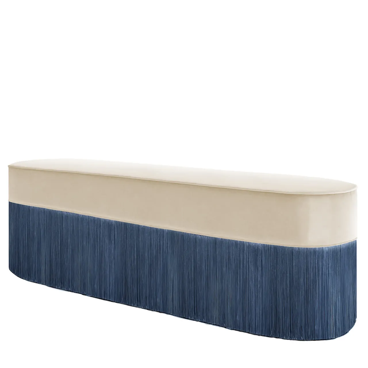 Eleganti e contrastanti tonalità di blu e beige sono state scelte rispettivamente per il trionfo di frange e per la morbida seduta in velluto che contraddistinguono questa superba panca. Con una silhouette allungata definita da lati curvi per una maggiore armonia, è un’aggiunta sofisticata alla fine dei letti matrimoniali moderni. Caratterizzata da una robusta struttura in faggio, è completamente personalizzabile su richiesta al Concierge. Ogni pezzo su misura è impresso sul fondo della fodera del pouf e firmato, numerato e datato personalmente dal designer.