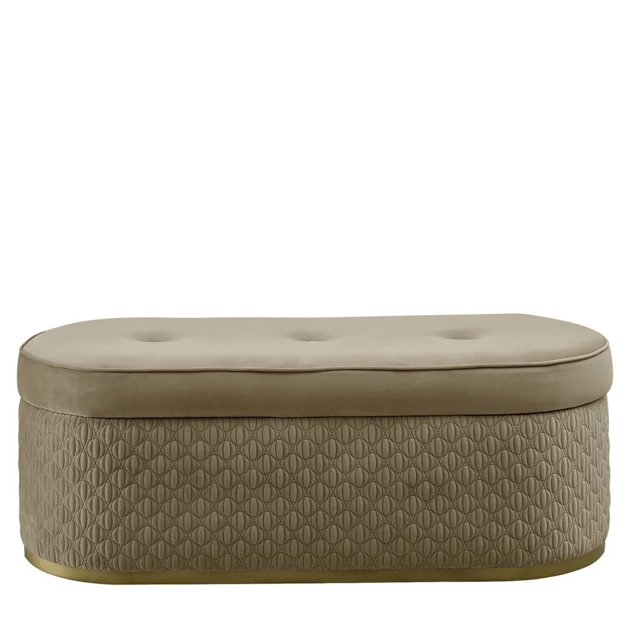 Elegante e sofisticato complemento d’arredo funzionale, questa raffinata panca è dotata di un piano che si apre per offrire un ampio spazio per cuscini e oggetti extra. Poggiato su una struttura in legno con profilo in ottone brunito, questo pezzo è imbottito in poliuretano espanso con un raffinato rivestimento in tessuto che vanta un raffinato effetto trapuntato.