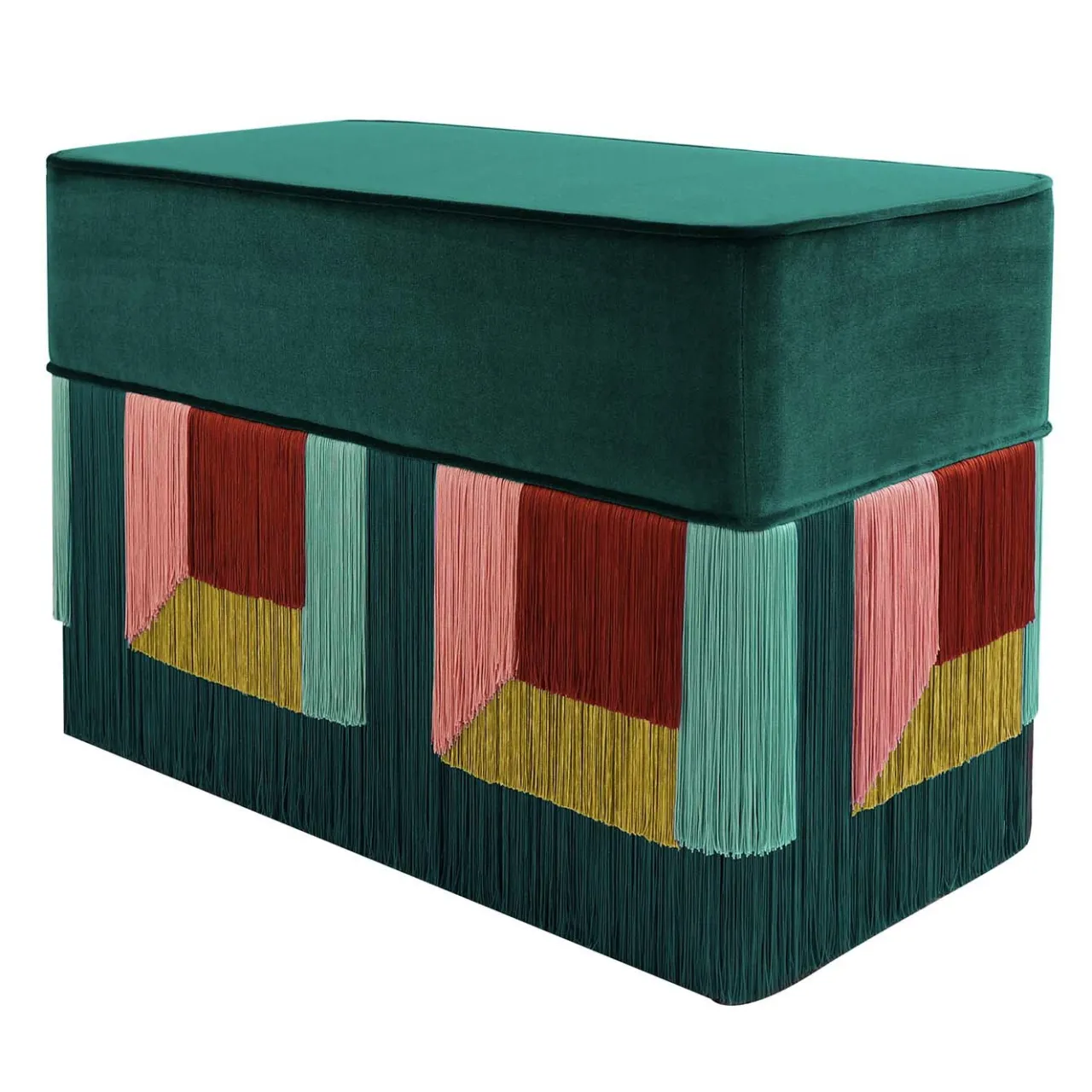 La sensibilità moderna dei disegni di Bozzoli caratterizza la sua collezione di pouf e panche, presentata alla Milano Design Week del 2019. Il senso di modernità è dato dall’uso di colori vivaci e forme geometriche. Appese a un cuscino verde smeraldo, frange color zaffiro, rosa e verde oliva si incontrano per formare eleganti forme rettangolari. Questo pezzo può essere esposto con altri oggetti di ispirazione couture ed è personalizzabile; per maggiori informazioni, rivolgersi al Concierge. Ogni pezzo su misura è timbrato sul fondo della fodera del pouf, firmato, numerato e datato personalmente dalla designer Lorenza Bozzoli. L’autenticità originale di ogni prodotto evidenzia la qualità artigianale e l’arte di un design di lusso dedicato. Ogni pezzo su misura è impresso sul fondo della fodera del pouf e firmato, numerato e datato personalmente dalla designer.