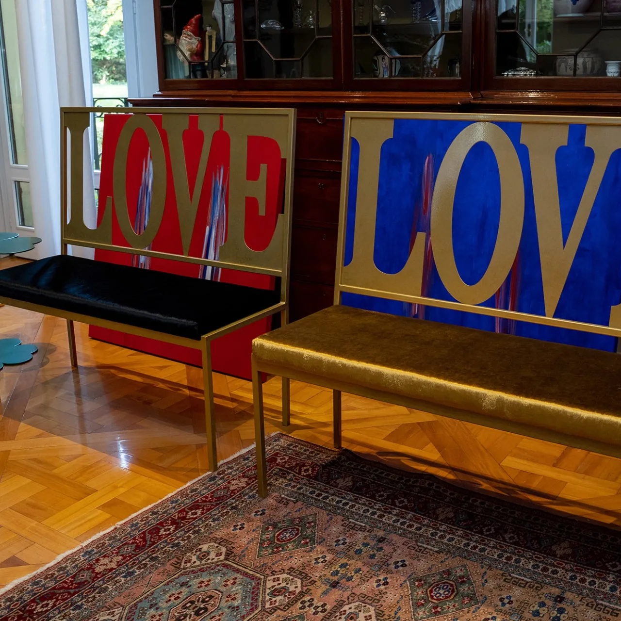 Parte della collezione Imperfect Love, ispirata dal desiderio di offrire oggetti di design dal fascino unico, questa panca in ferro lavorata a mano presenta una calda finitura dorata e un rivestimento della seduta in velluto coordinato. Disponibile anche in nero con rivestimento in velluto nero, blu, bronzo o grigio, la struttura sottile è caratterizzata da uno schienale aperto con quattro grandi lettere in stampatello che compongono la parola “LOVE”. Un pezzo originale per completare un arredamento contemporaneo ed eclettico, questa panca aggiunge un elemento di fascino artistico e può essere abbinata alle sedie a lettere, ai tavolini e alla consolle per un look coeso e giocoso. Ogni pezzo è unico e, a causa della lavorazione a mano, possono verificarsi lievi variazioni.