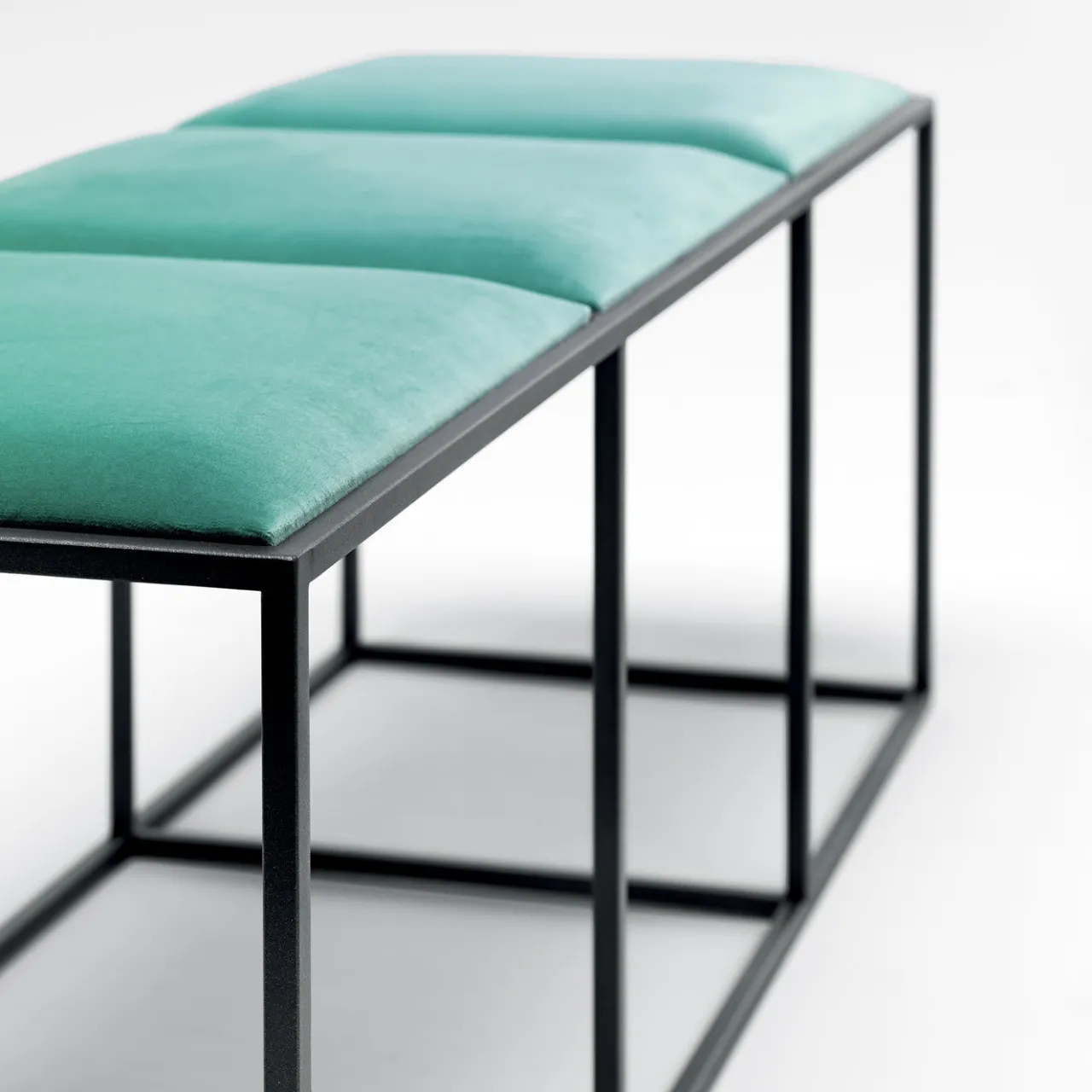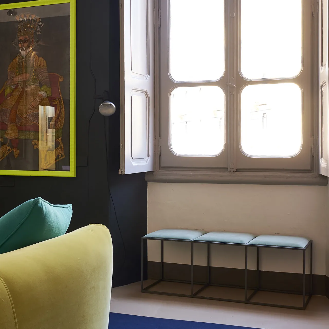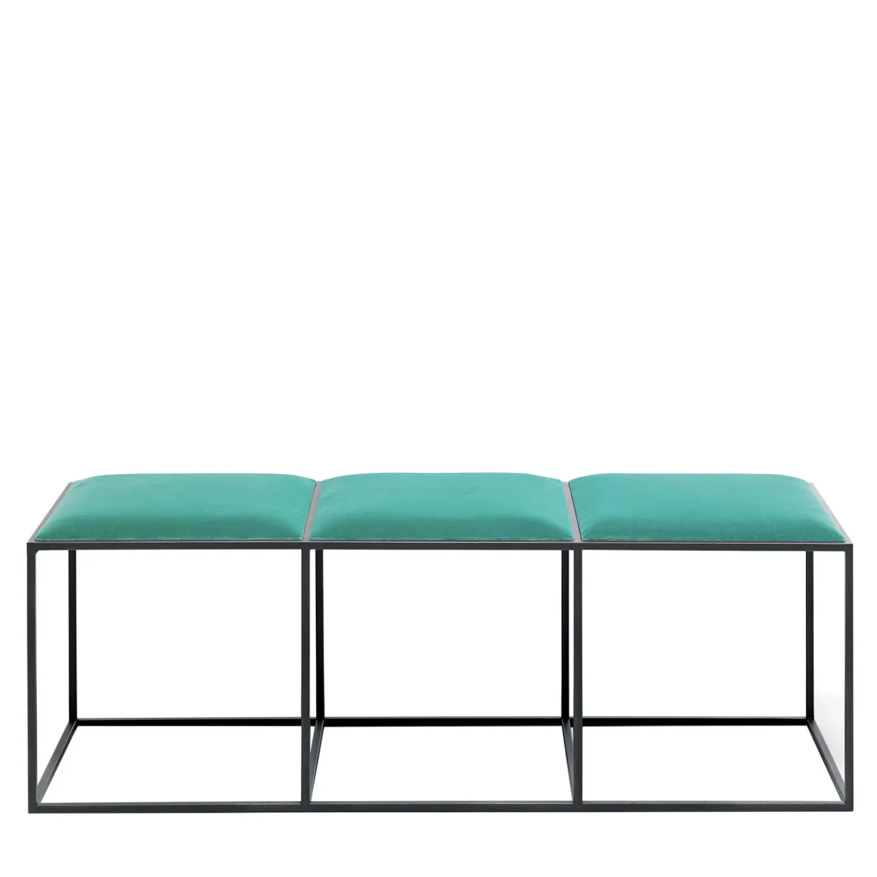 Elegante combinazione di materiali naturali e industriali, questa panca realizzata a mano da Federico Carandini, 2018, cattura l’essenza della filosofia di Eponimo di creare pezzi accattivanti tra il minimal e l’opulento. Questo design compatto ha una struttura leggera in acciaio composta da sottili aste squadrate rifinite in colore grigio cadetto che formano tre quadrati aperti. La seduta imbottita è rivestita in tessuto di cotone vellutato in una raffinata tonalità di mare. Questa panca sarà un accento funzionale e alla moda in un ingresso, una camera da letto o un soggiorno. Presentata al Fuorisalone durante la Milano Design Week 2018.